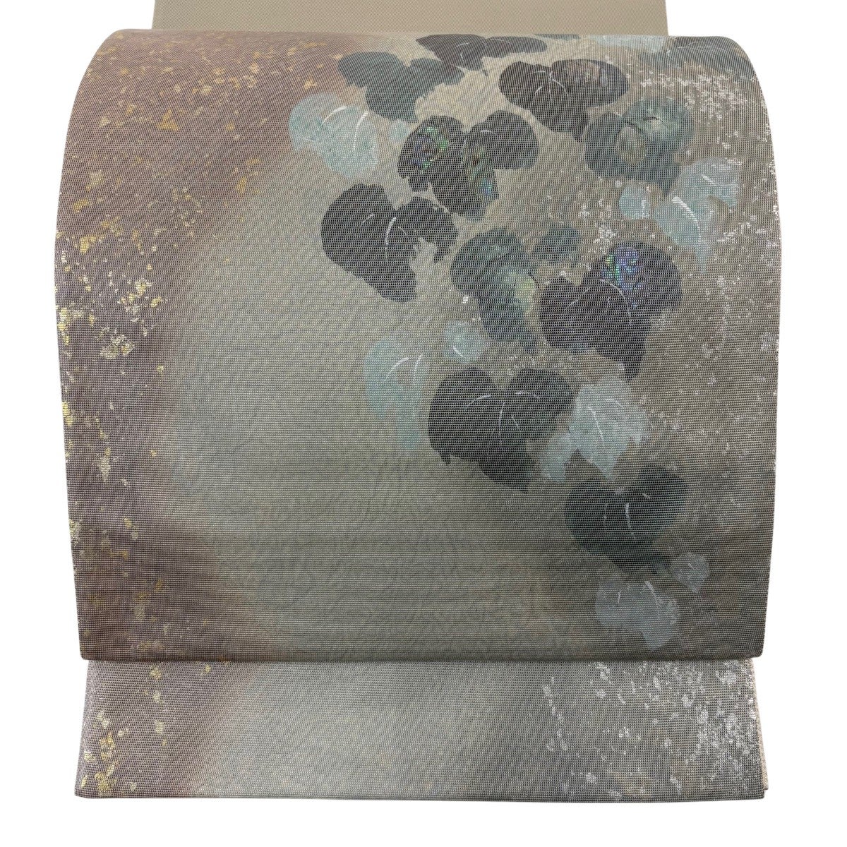 【美品】 袋帯 秀品 華文 裂取り 金糸 箔 青灰色 六通 正絹