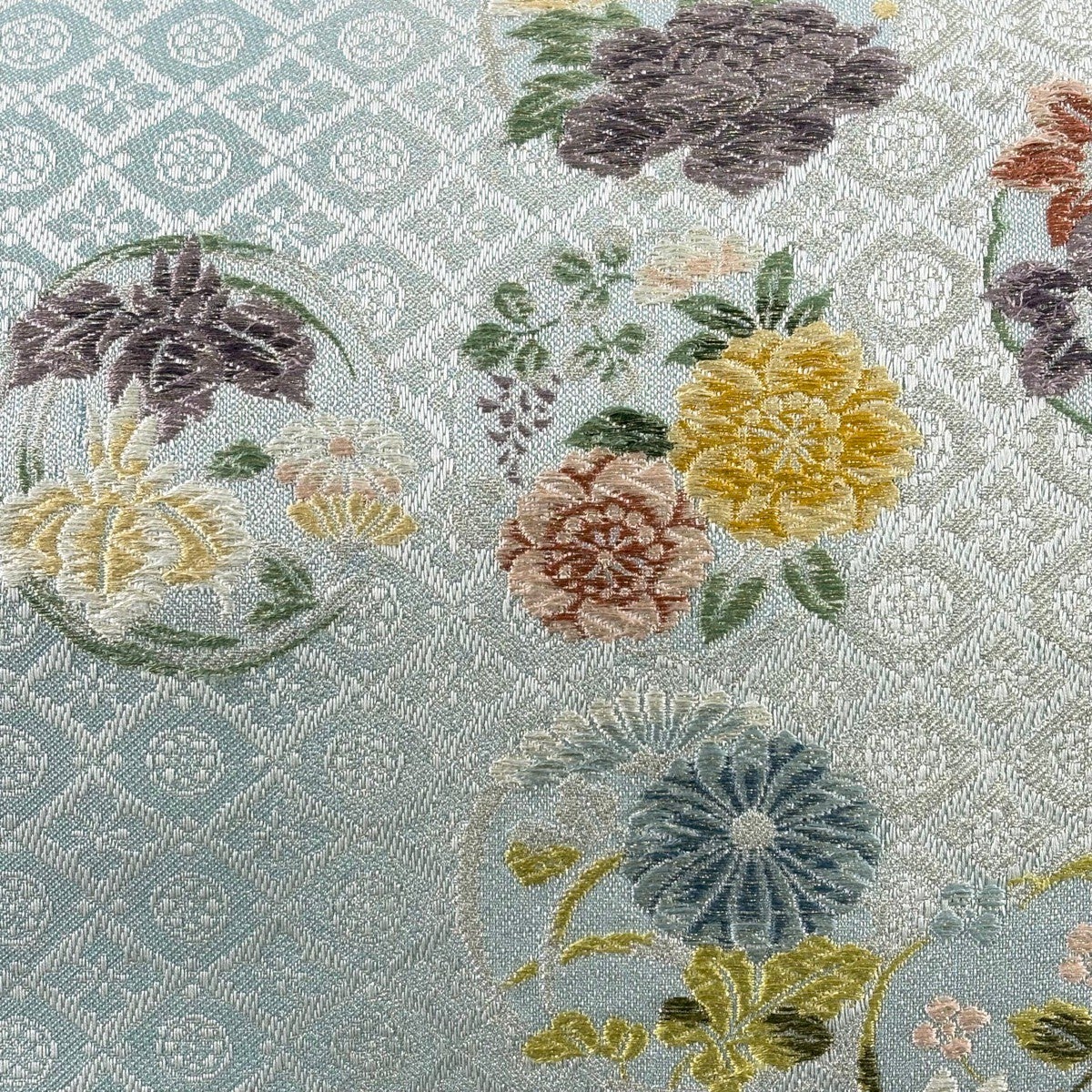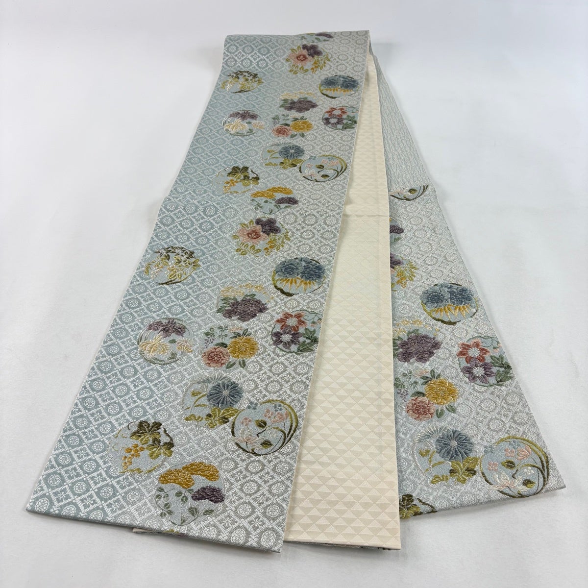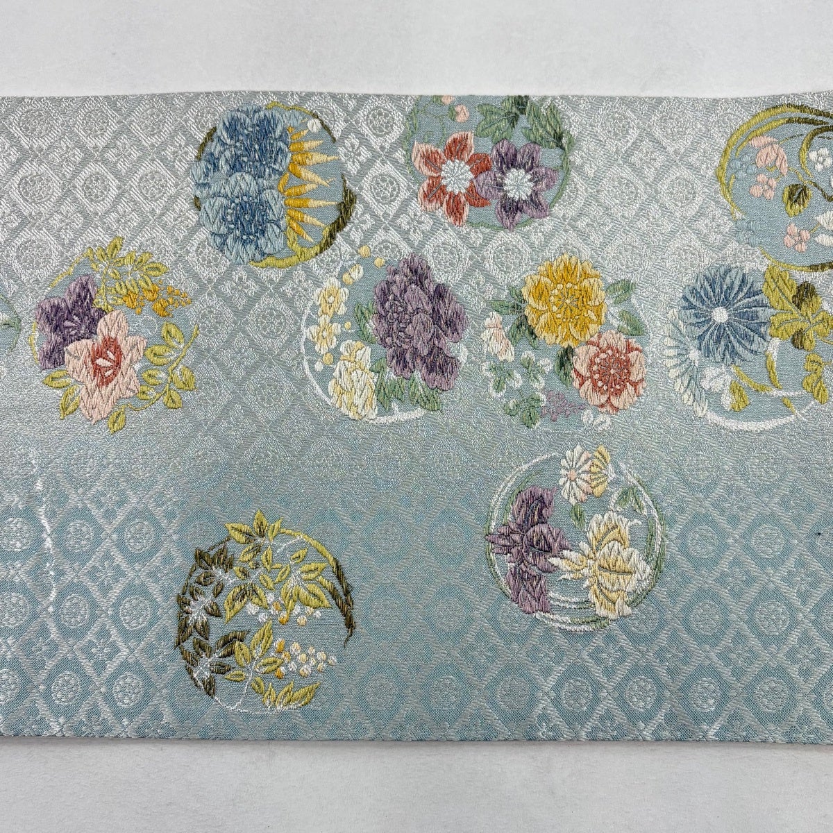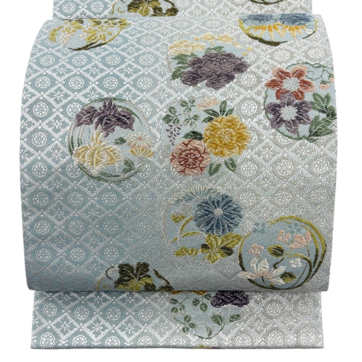 【美品】 袋帯 秀品 花丸文 花菱 唐織 金銀糸 水色 六通 正絹