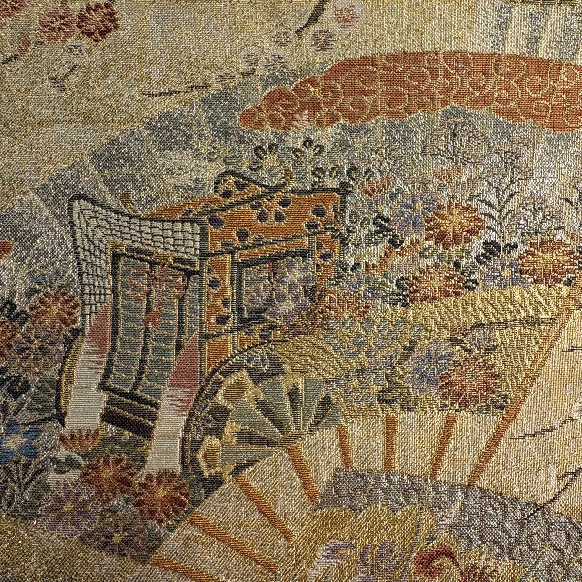 【美品】 袋帯 名品 御所車 草花 金糸 箔 薄茶色 六通 正絹