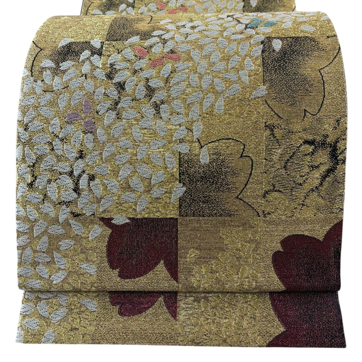袋帯 秀品 証紙あり 振袖向き 桜 麻の葉 唐織 箔 金茶 六通 正絹