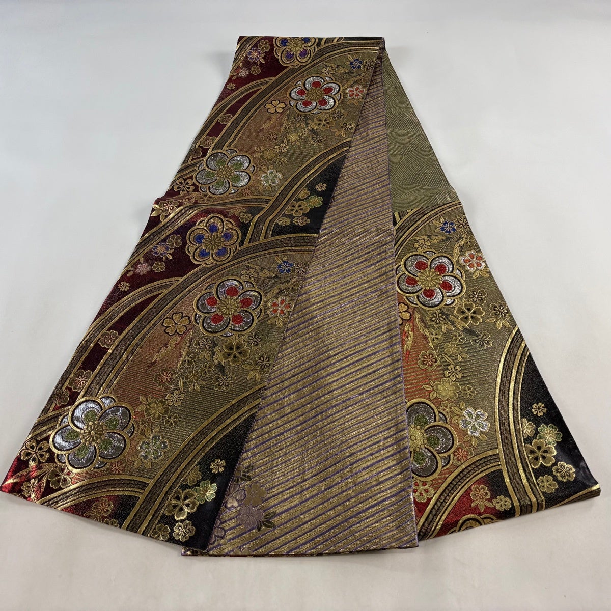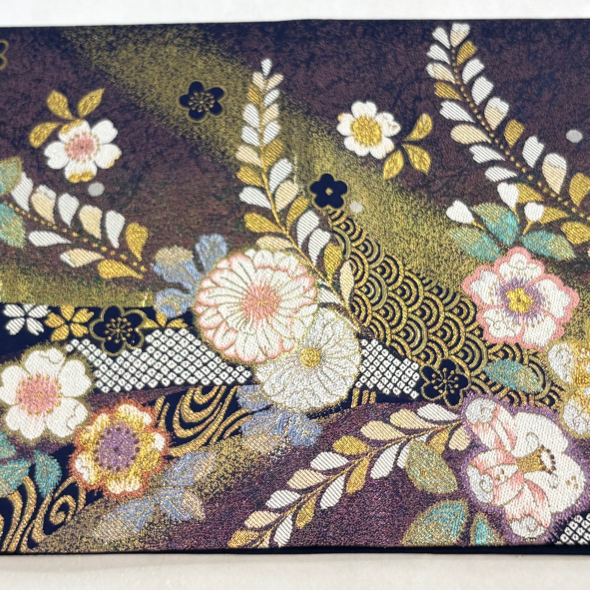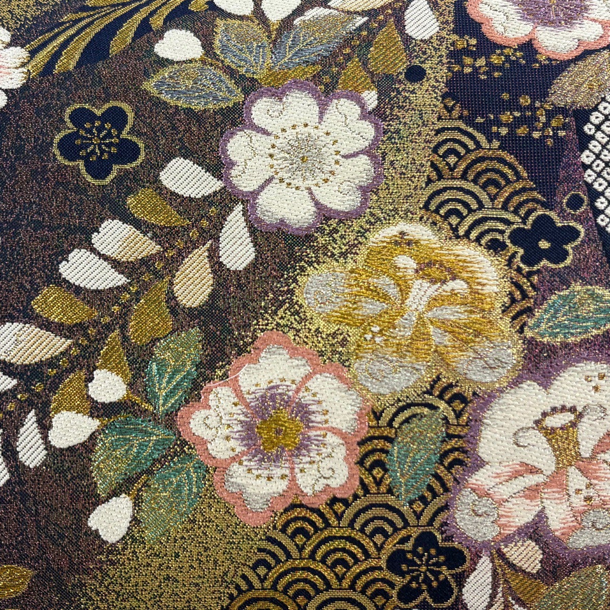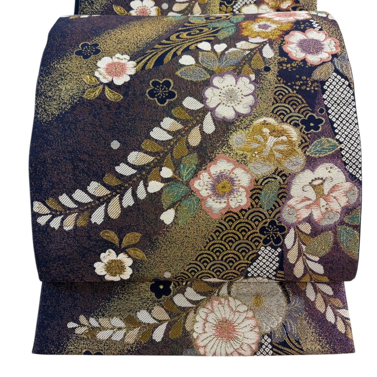 【美品】 袋帯 秀品 振袖向き 梅 波 箔 唐織 焦茶色 六通 正絹