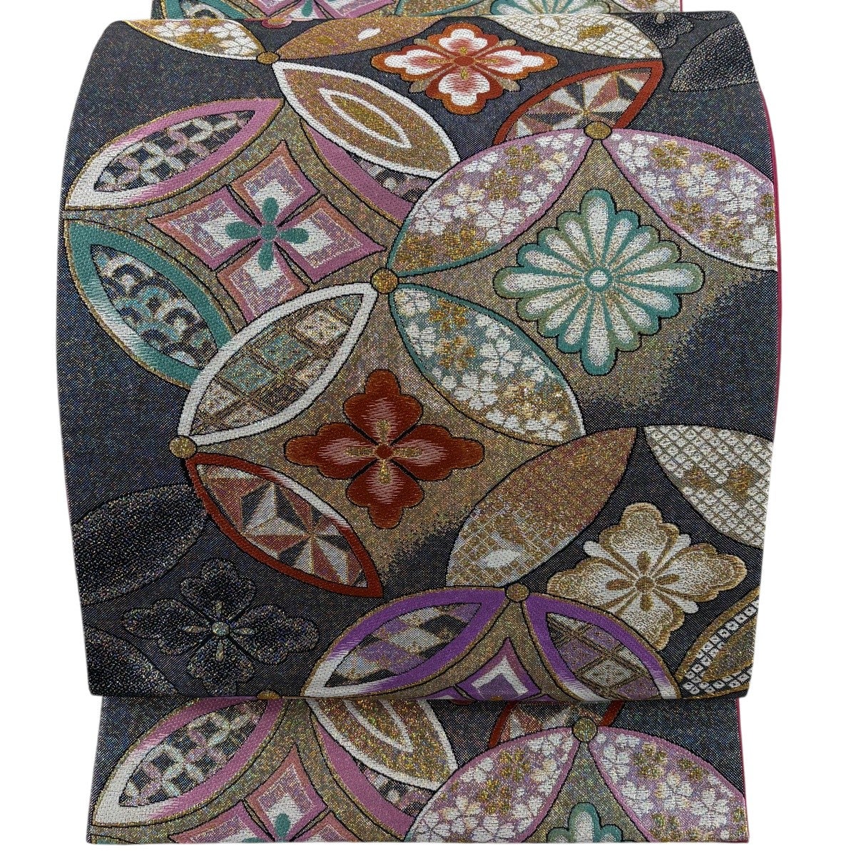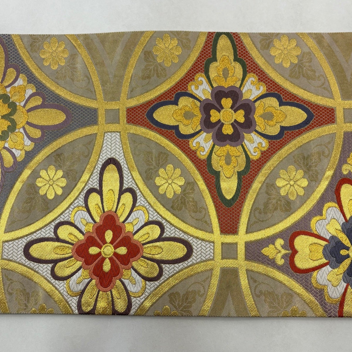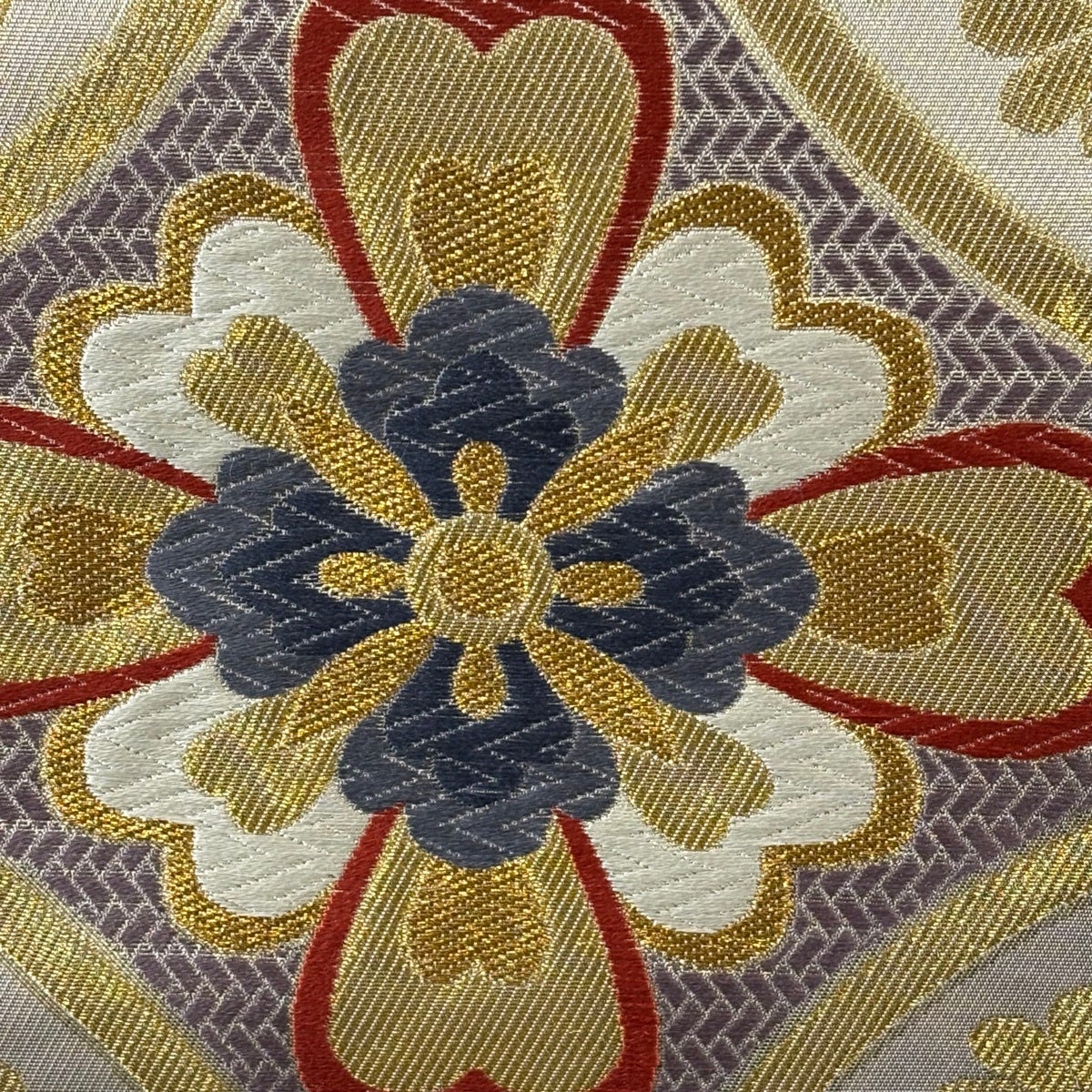 【美品】 袋帯 秀品 振袖向き 花菱 七宝 金糸 箔 灰色 六通 正絹