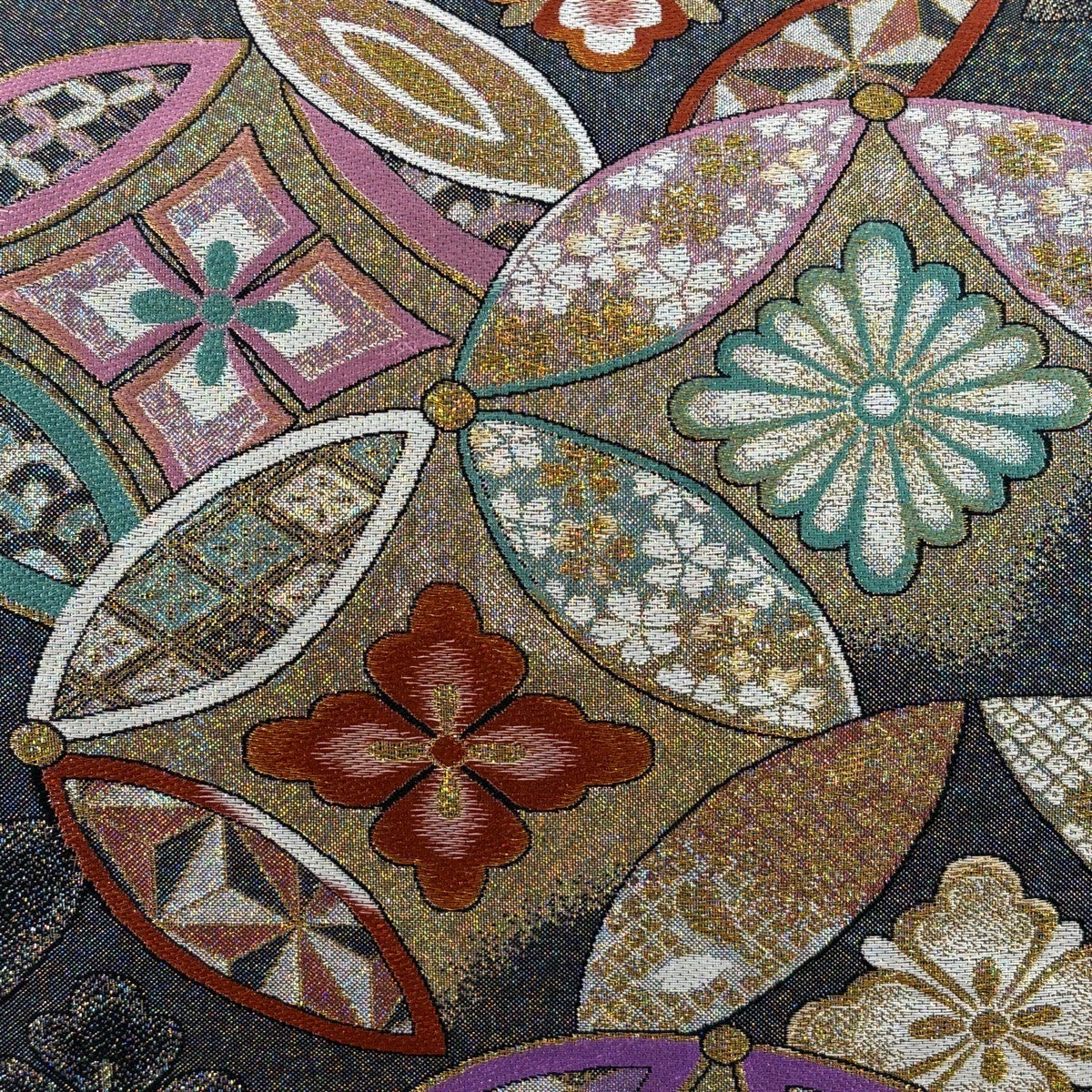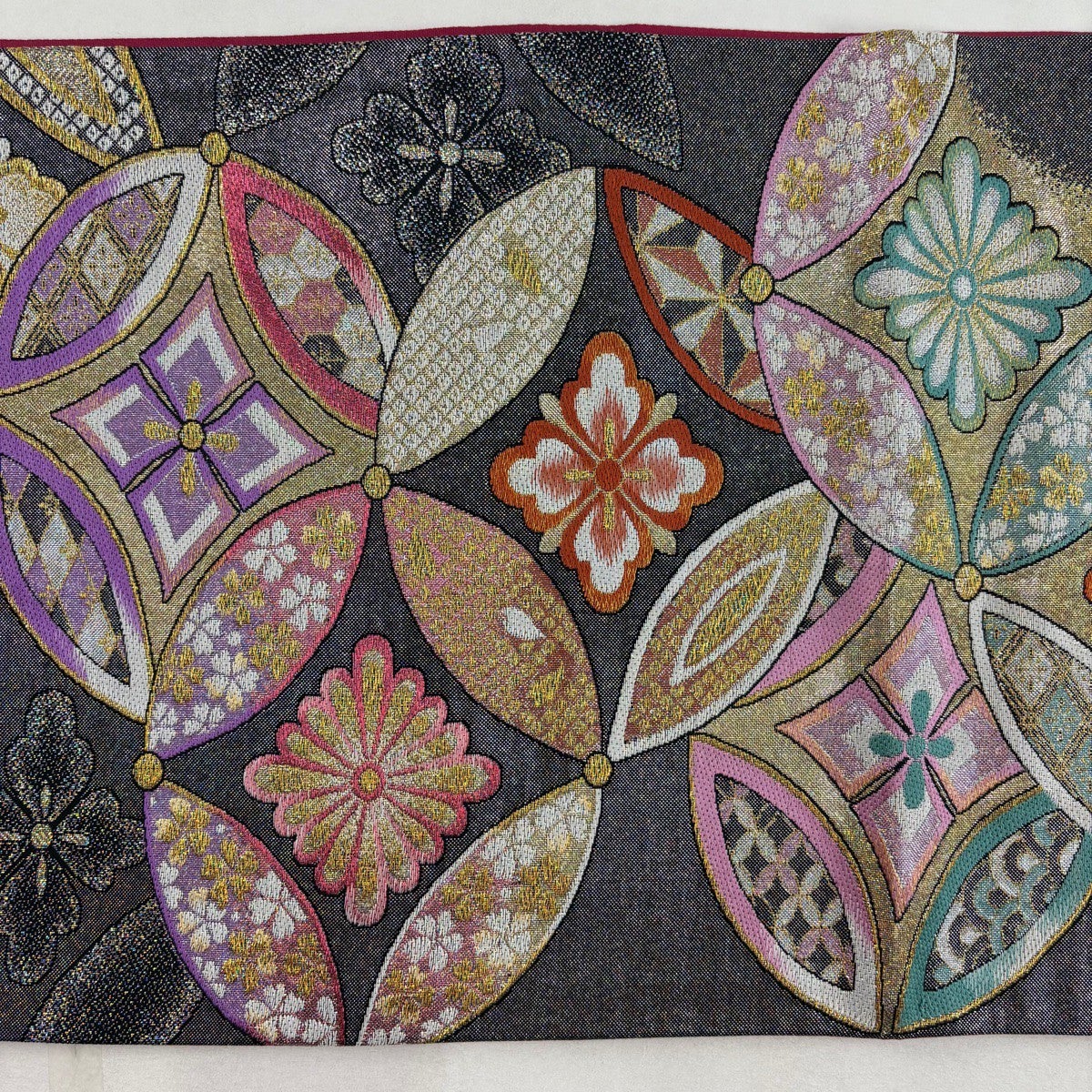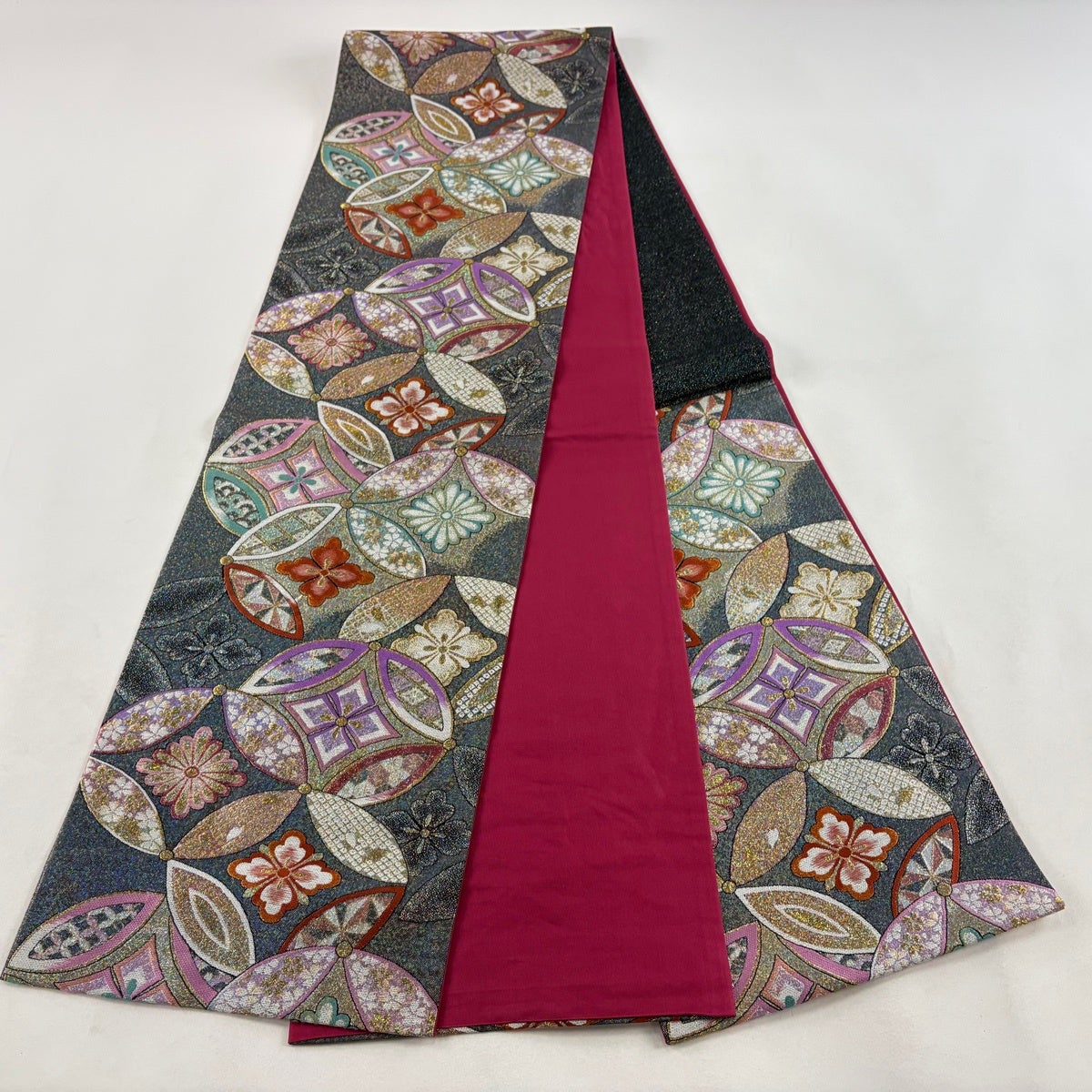 【美品】 袋帯 秀品 振袖向き 花菱 七宝 金糸 箔 灰色 六通 正絹