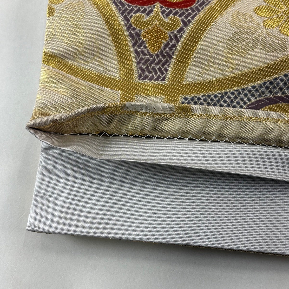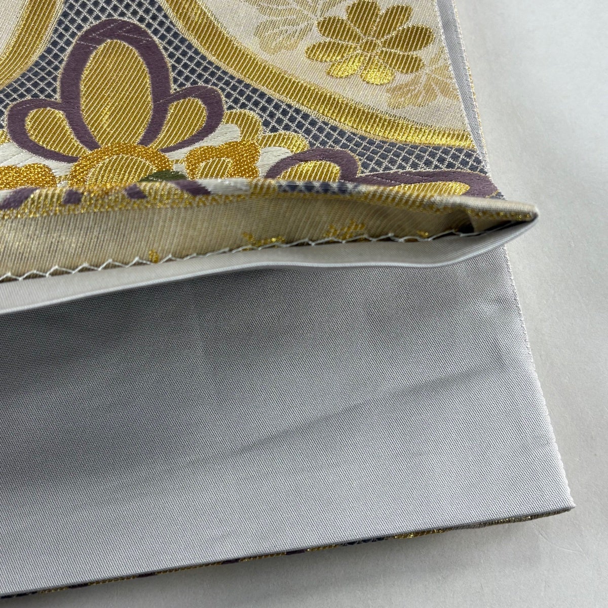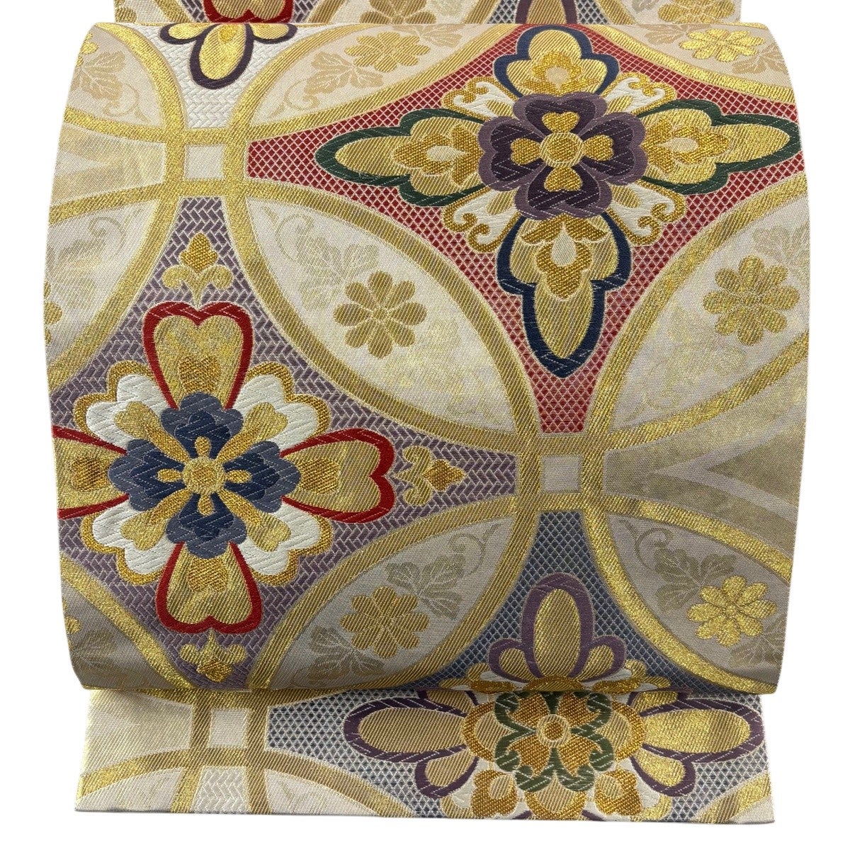 【美品】 袋帯 秀品 振袖向き 雪輪 華文 金糸 箔 銀色 六通 正絹