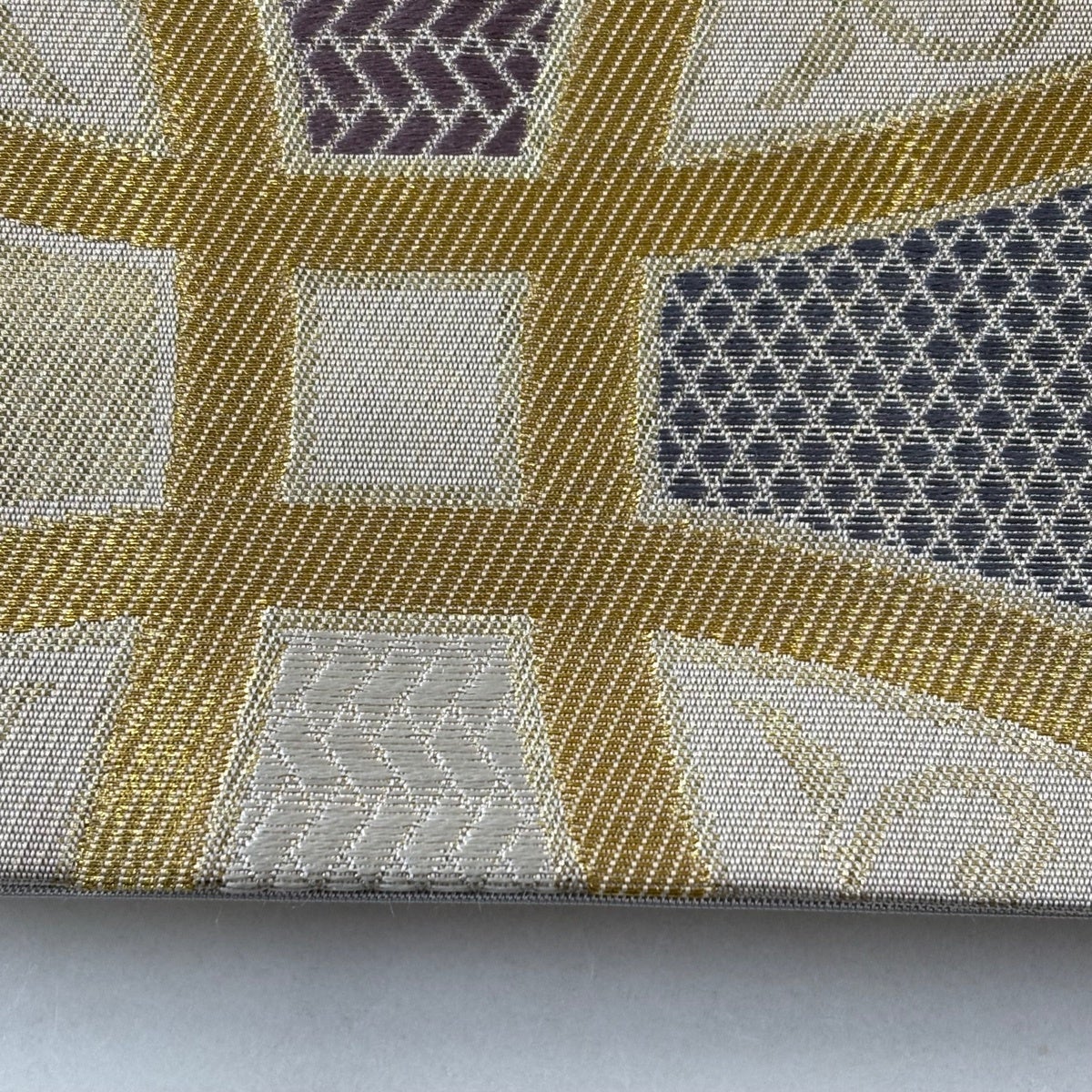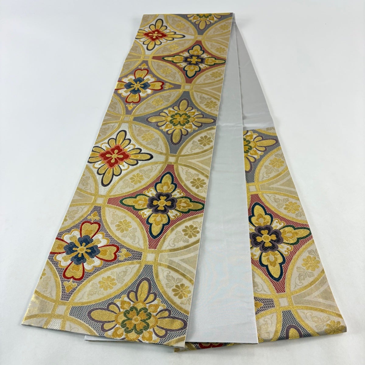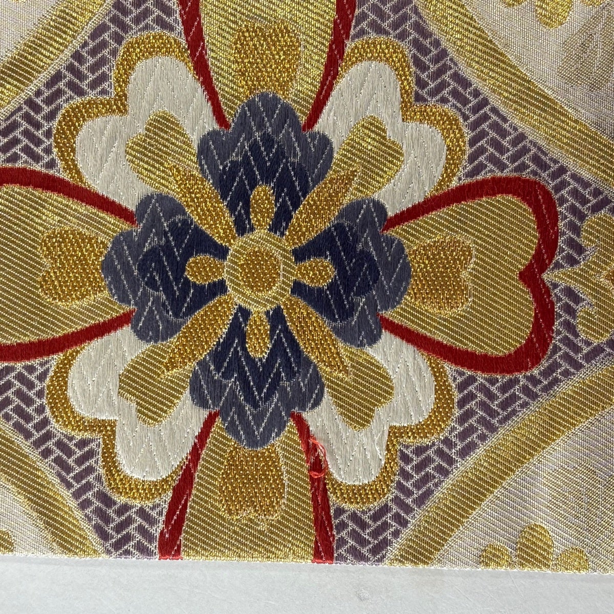 【美品】 袋帯 秀品 振袖向き 雪輪 華文 金糸 箔 銀色 六通 正絹