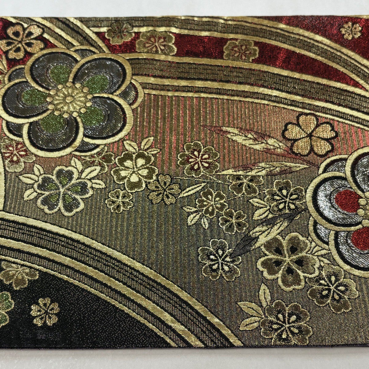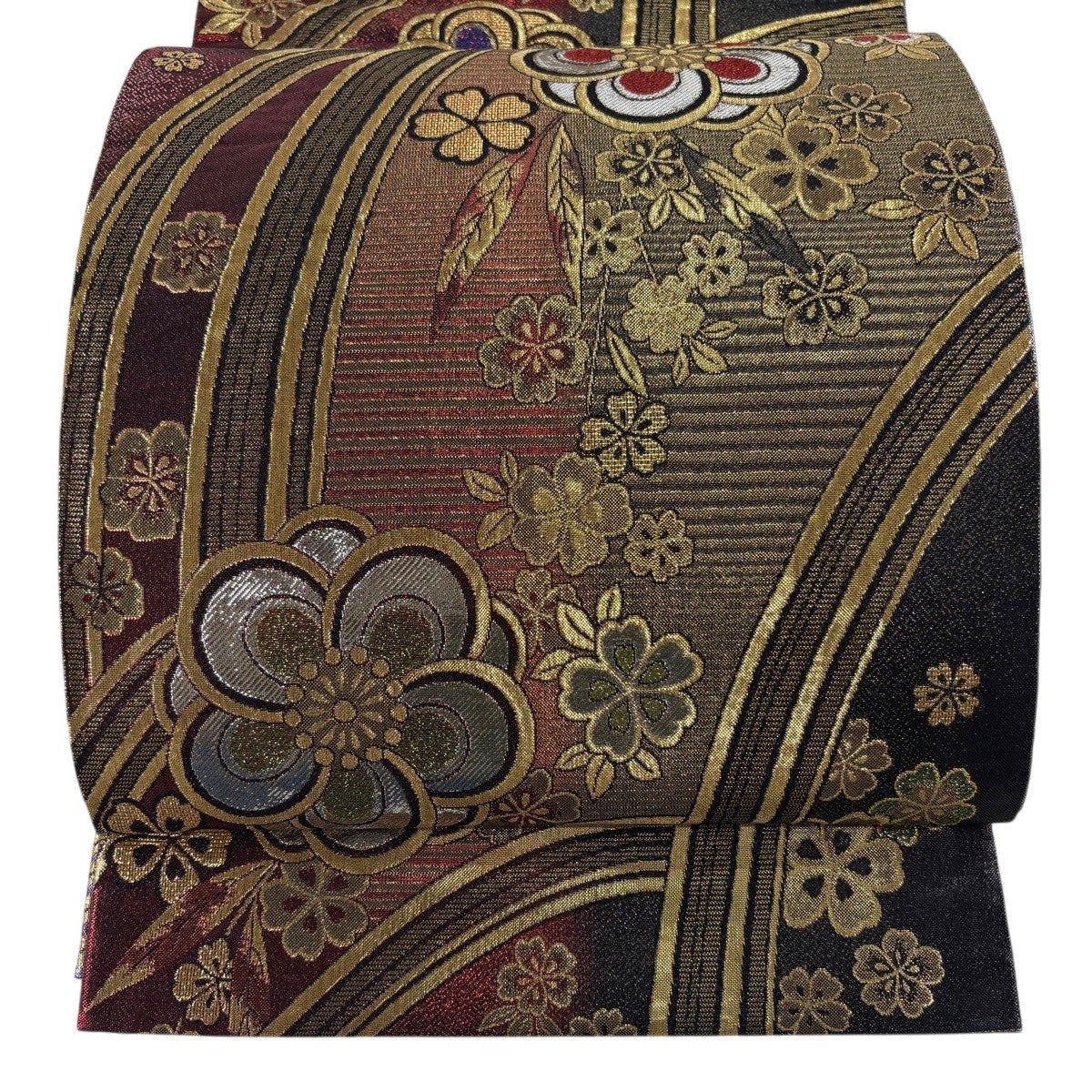 袋帯 秀品 振袖向き 枝垂れ桜 有職文様 金糸 箔 焦茶色 六通 正絹