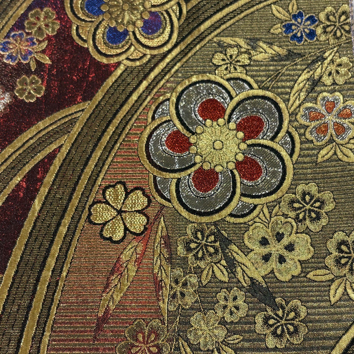 【美品】 袋帯 秀品 振袖向き 草花 金銀糸 箔 えんじ色 六通 正絹