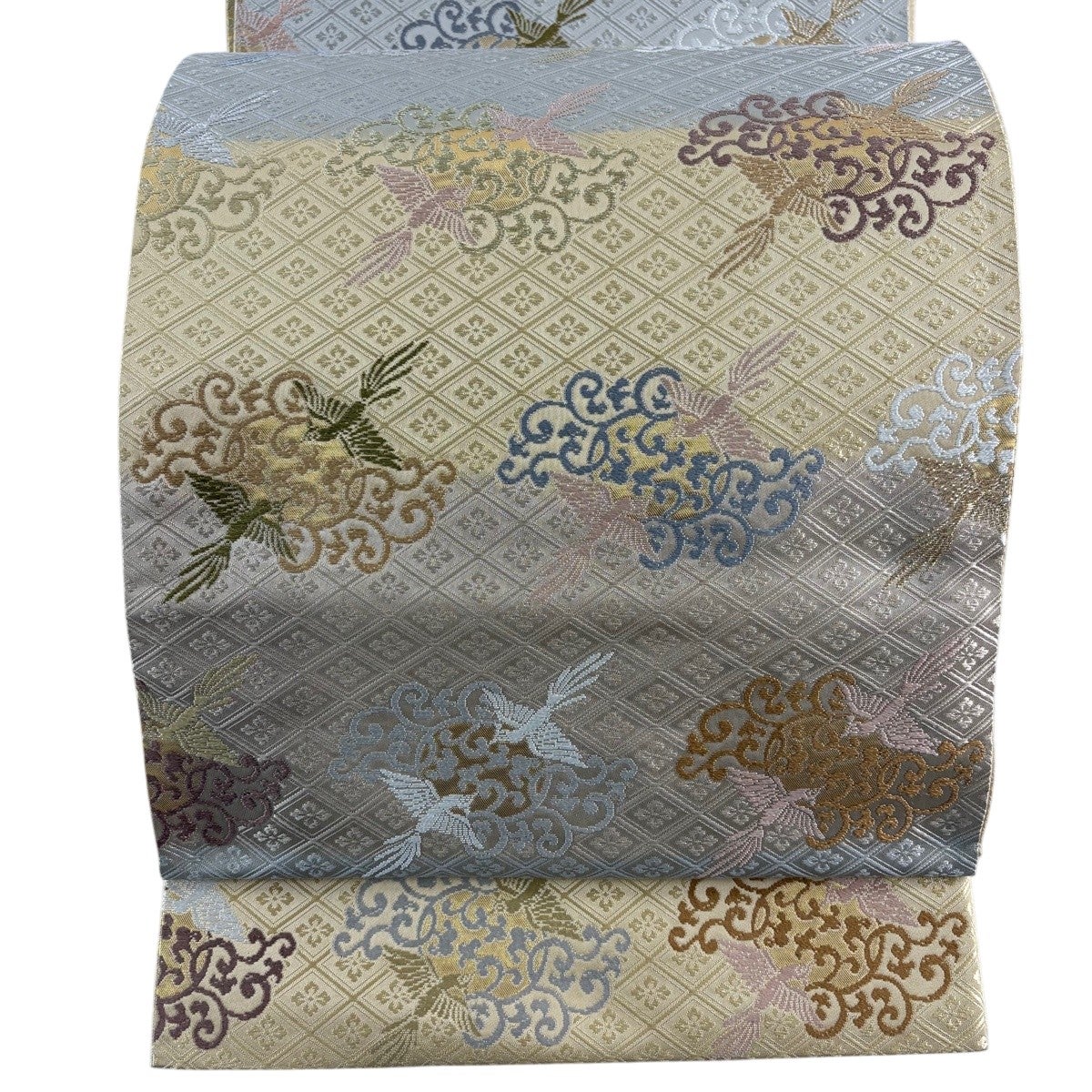 【美品】 袋帯 名品 菱格子 花菱 金糸 箔 ベージュ 六通 正絹