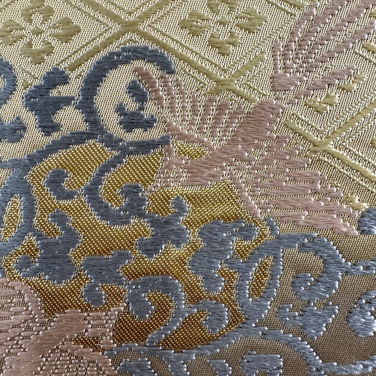 【美品】 袋帯 名品 鳳凰唐草菱文 金糸 箔 ベージュ 六通 正絹