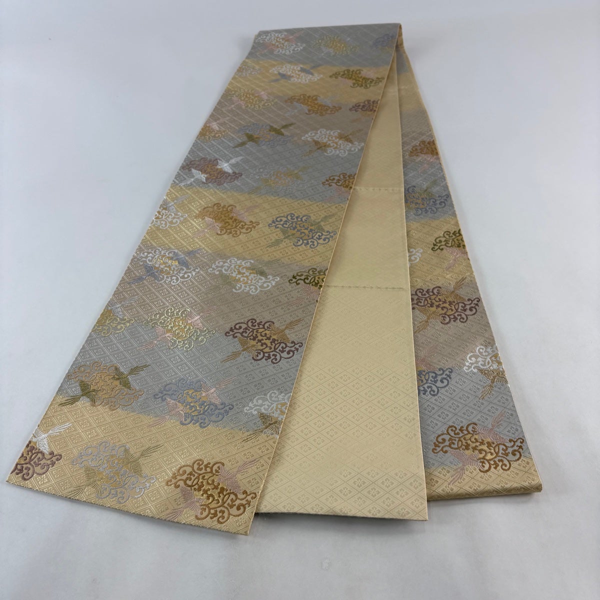 【美品】 袋帯 秀品 弥生錦 全通袋帯 華文 鳥 金糸 箔 灰色 全通 正絹