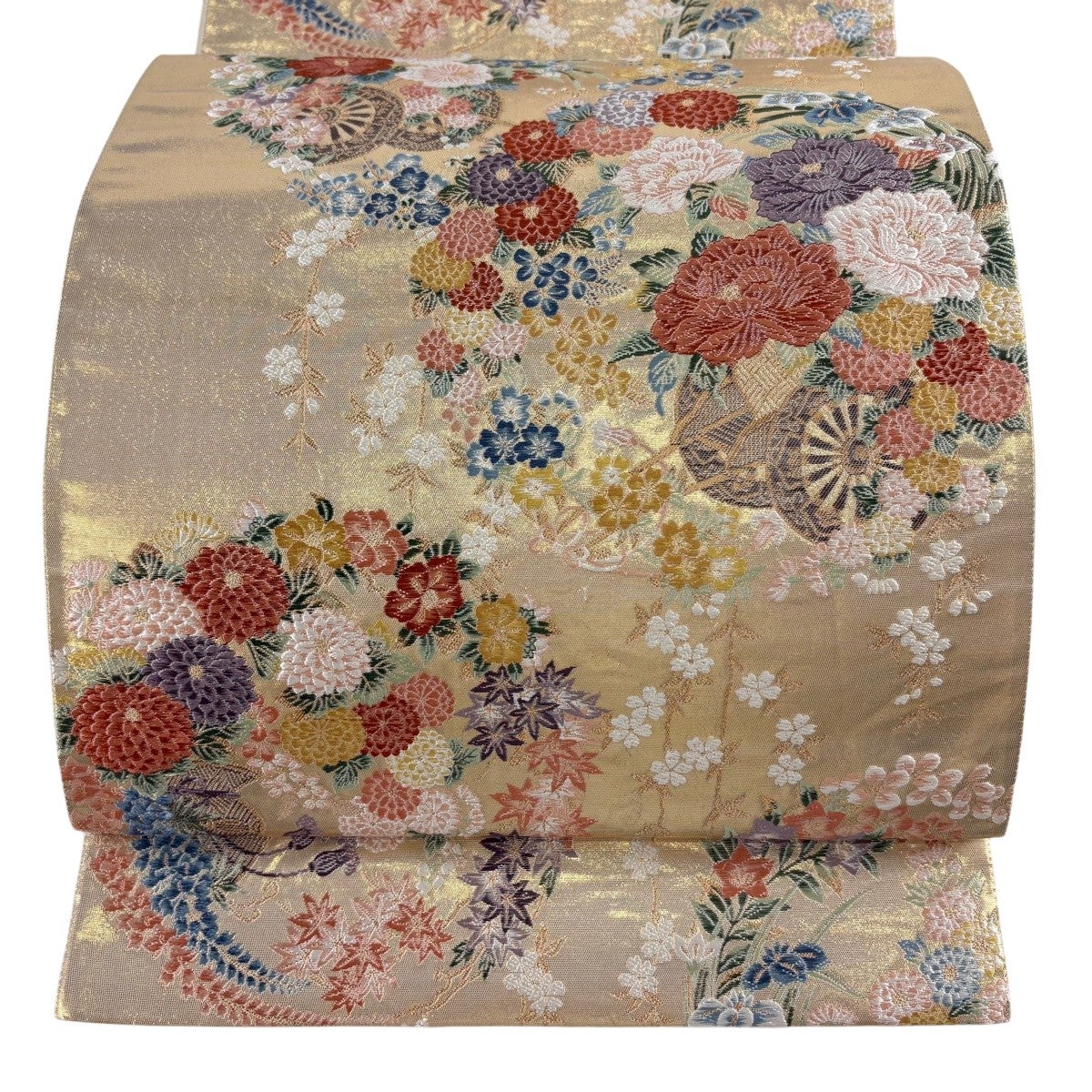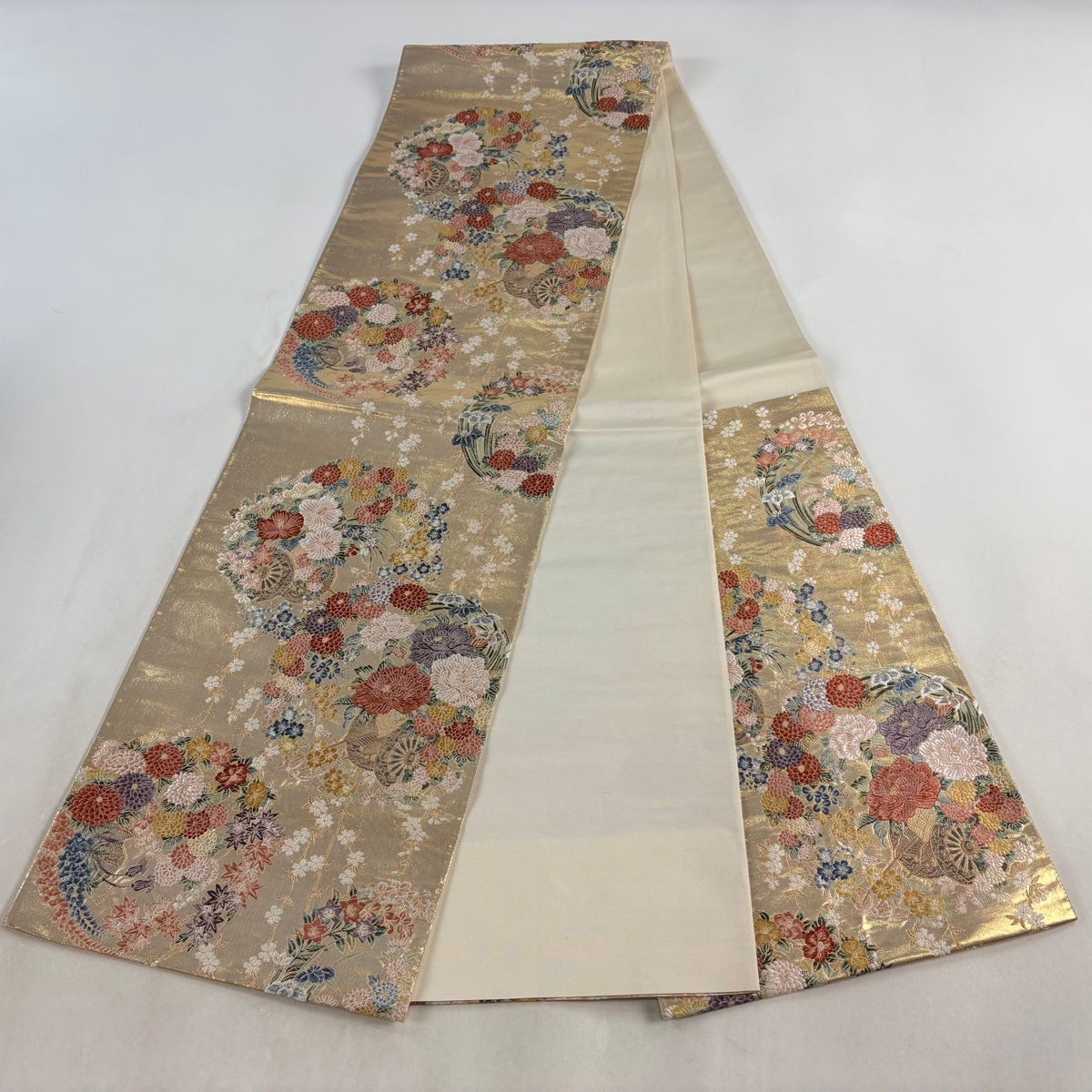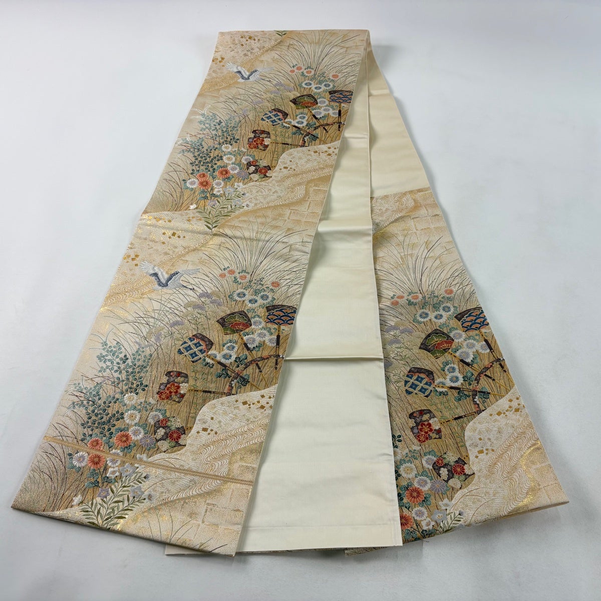 【美品】 袋帯 秀品 色紙 草花 金銀糸 箔 ベージュ 六通 正絹