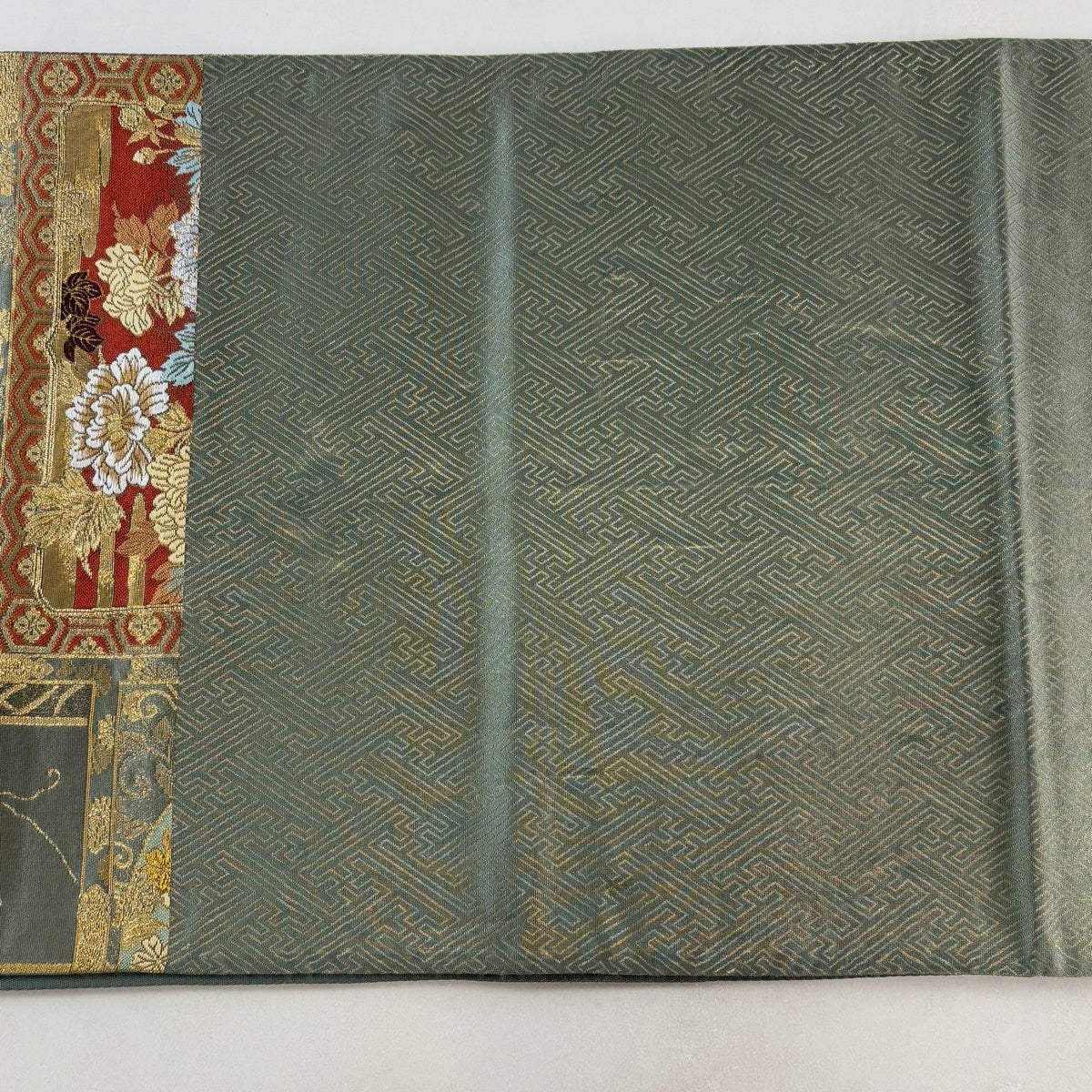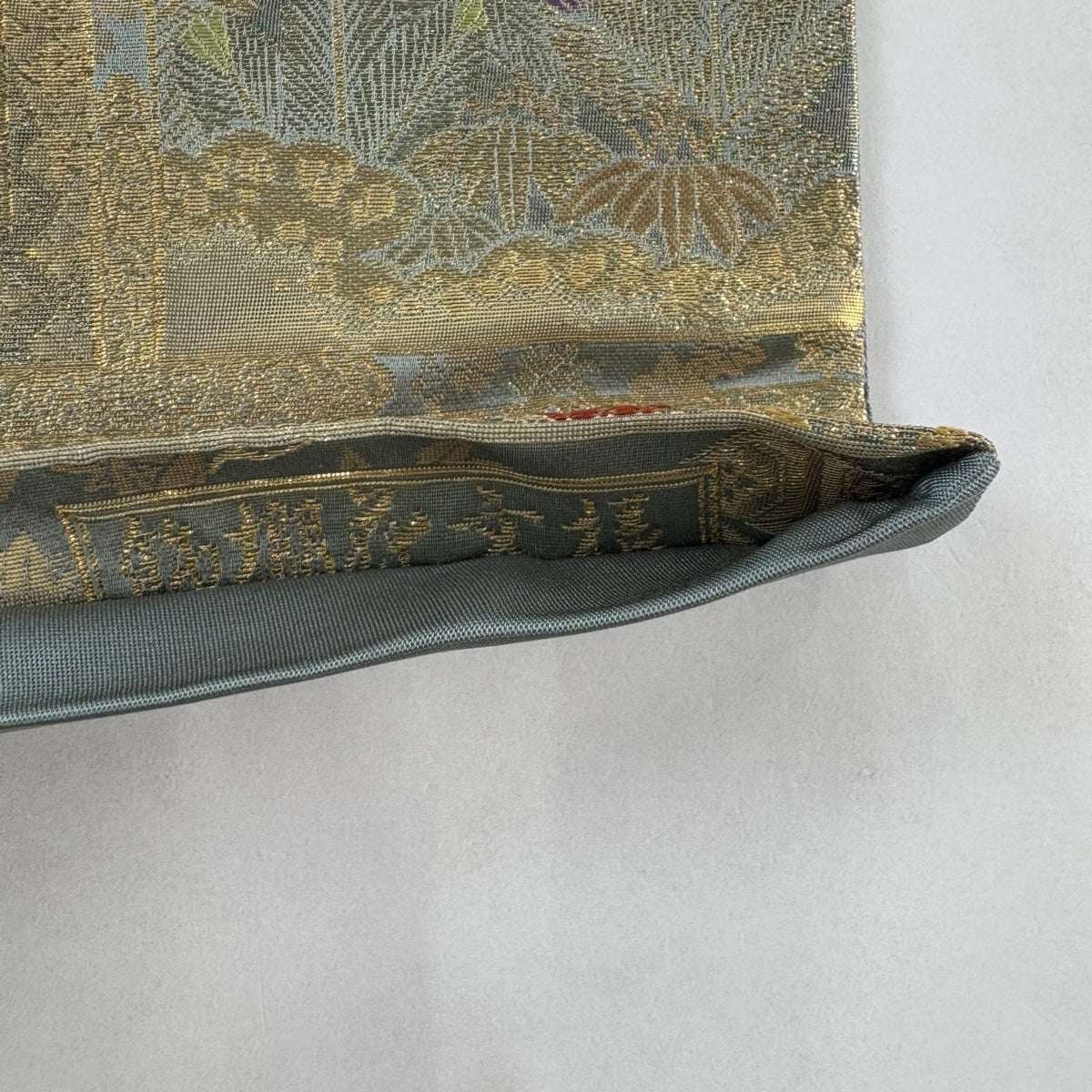 【美品】 袋帯 秀品 関西仕立て 鎧威し 菊 箔 灰緑 お太鼓柄 正絹