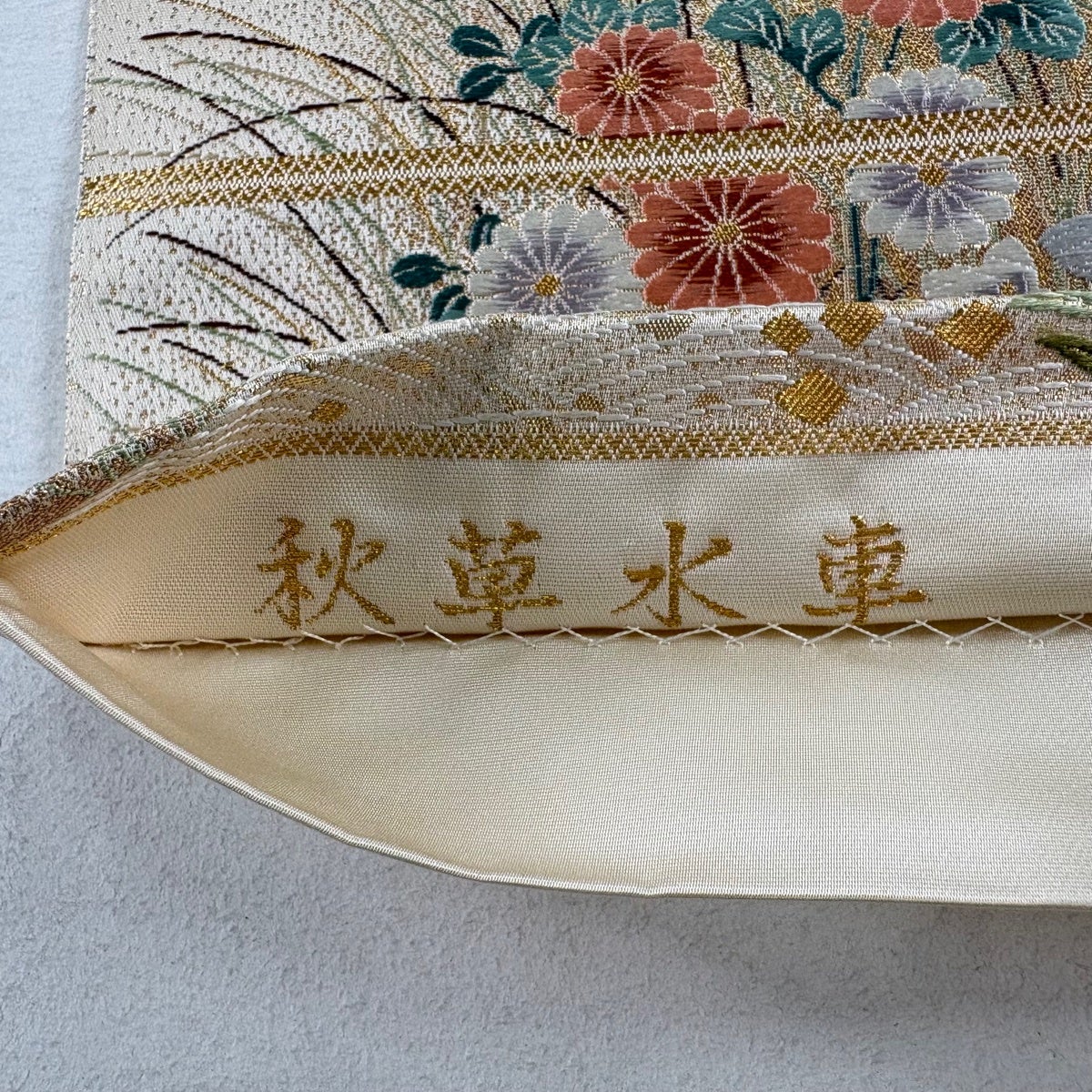 袋帯 秀品 渡文 落款あり 菊 萩 金糸 箔 ベージュ 全通 正絹