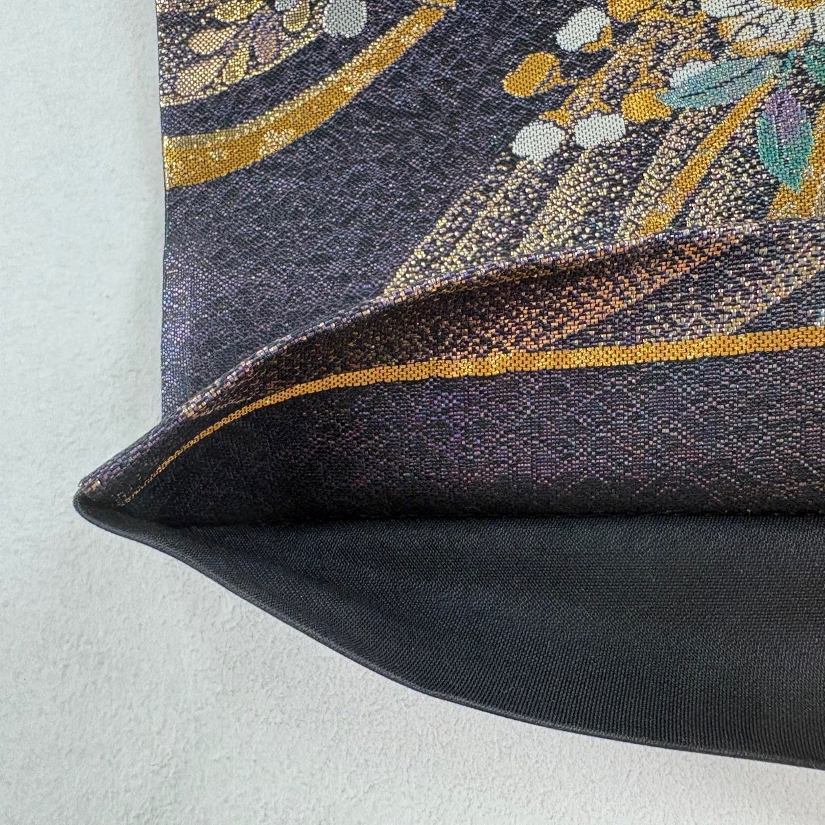 【美品】 袋帯 秀品 彫金 松皮取蒔絵菊紋 金糸 箔 黒灰 六通 正絹