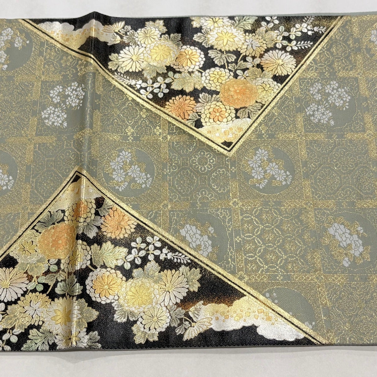 【美品】 袋帯 秀品 関西仕立て 丸文 草花 金糸 箔 灰色 六通 正絹
