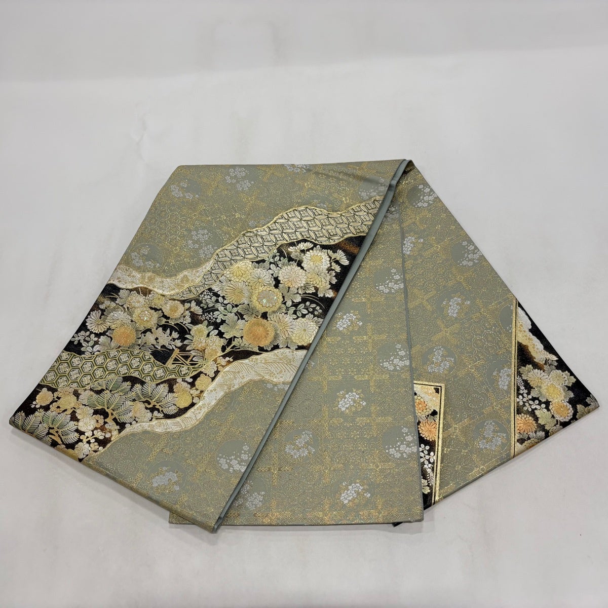 【美品】 袋帯 秀品 道長取り 秋草 金銀彩 螺鈿 灰緑 お太鼓柄 正絹