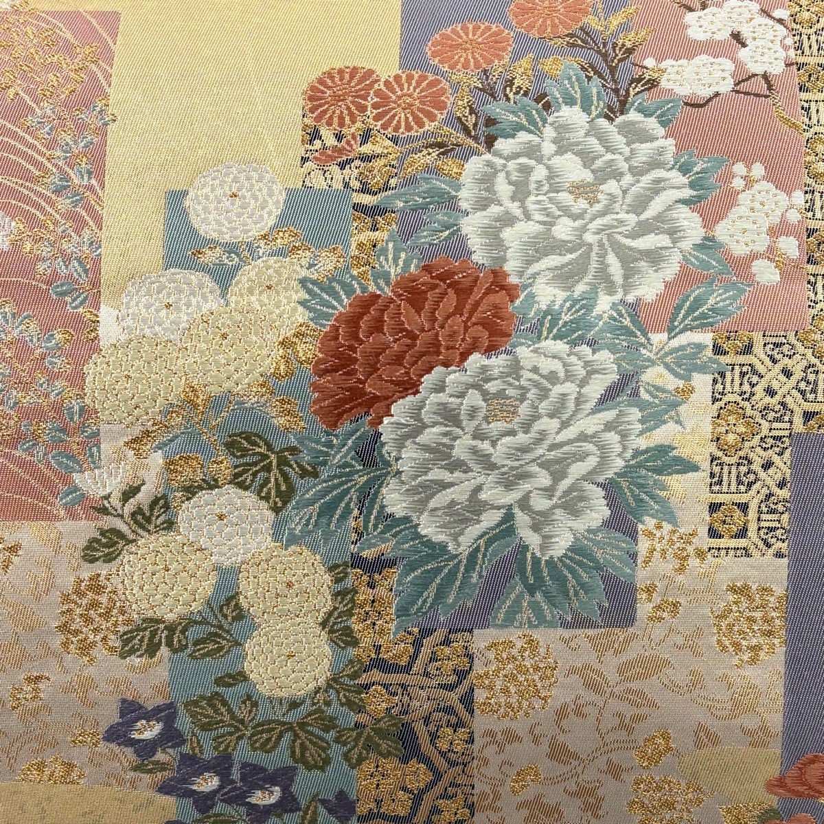 袋帯 逸品 じゅらく 落款あり 色紙 草花 唐織 金銀糸 金色 六通 正絹