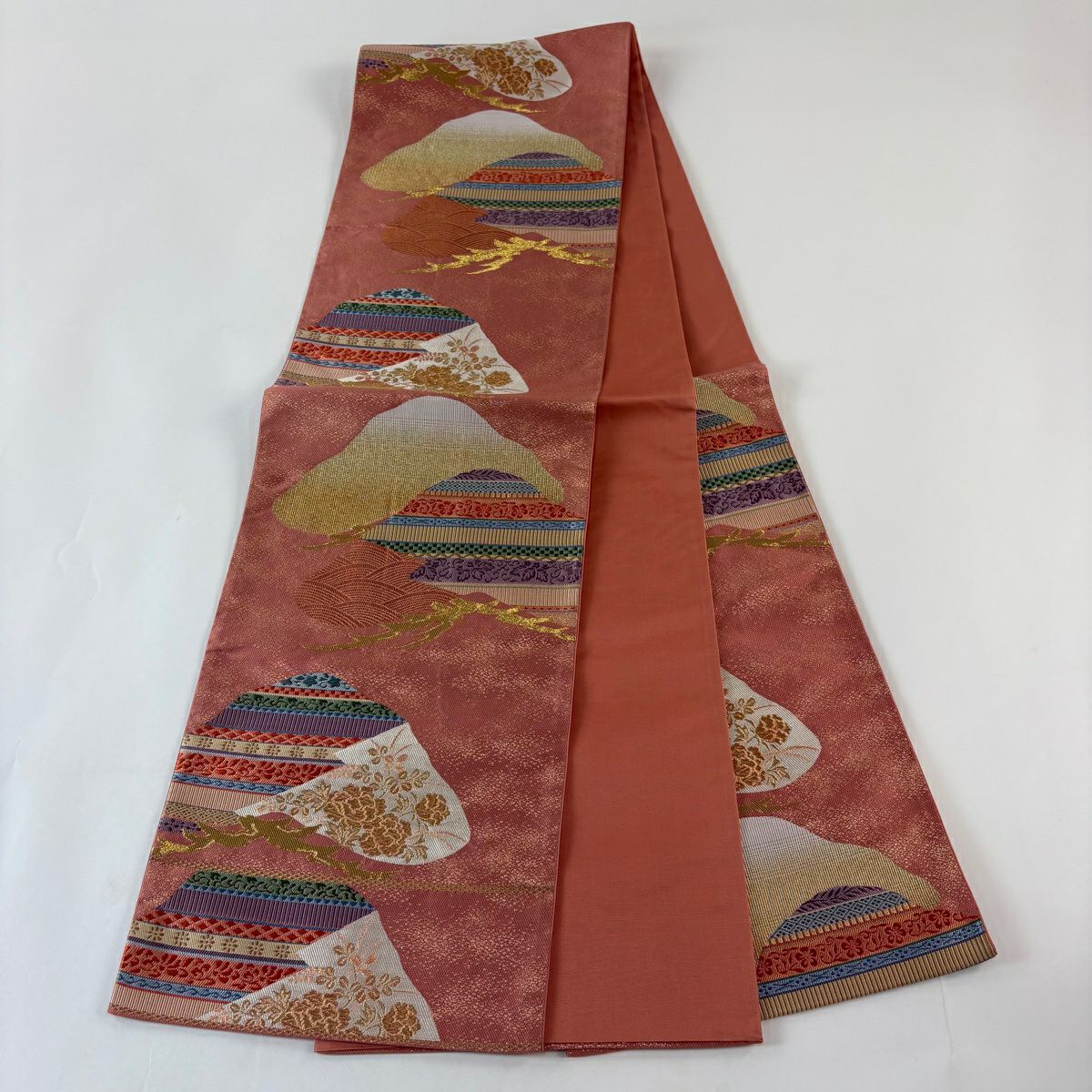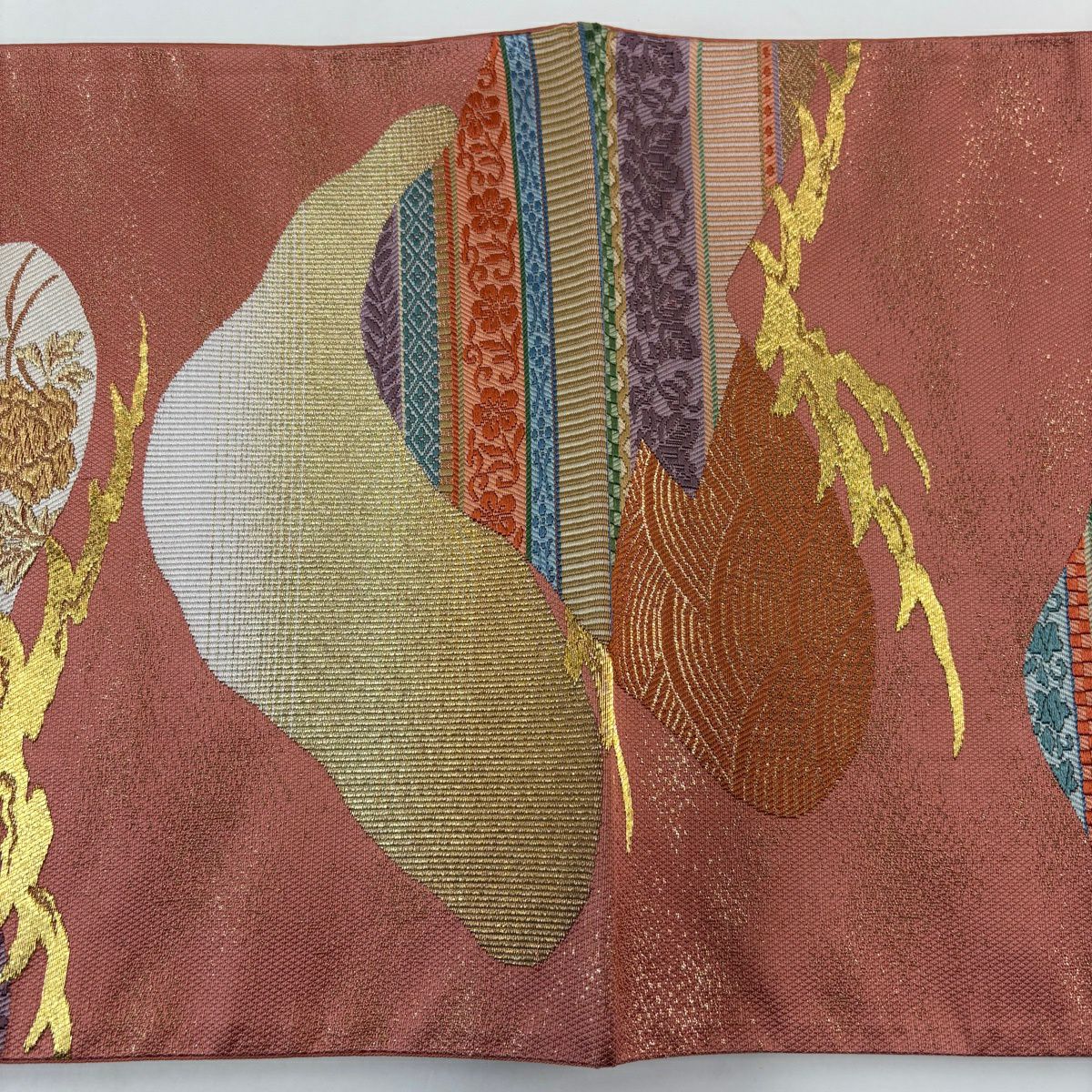 袋帯 秀品 関西仕立て 豊楽古代裂 花唐草 波 金糸 箔 ピンク 六通 正絹