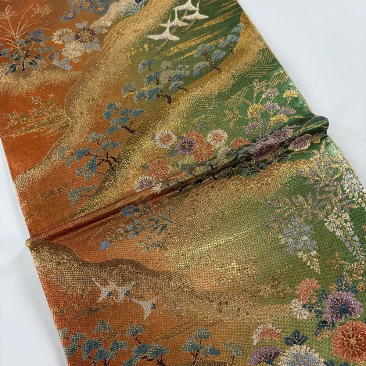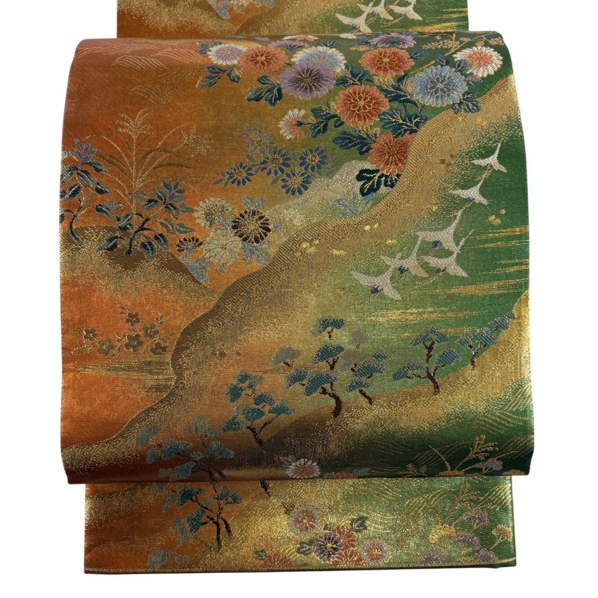 【在庫一掃】 袋帯 逸品 鈴乃屋 能衣青海取菊笹文様 金糸 金茶 全通 正絹