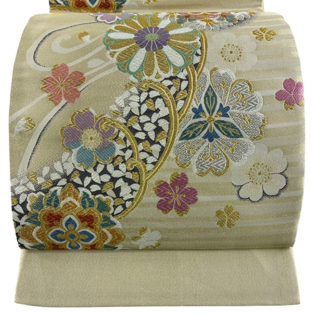 【美品】 袋帯 秀品 証紙あり 華文 桜 金銀糸 刺繍 ベージュ 六通 正絹