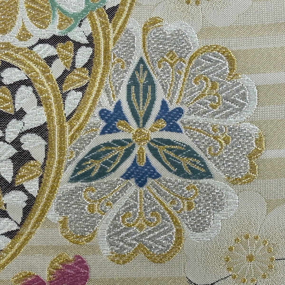 【美品】 袋帯 秀品 四季花の丸 七宝 金銀糸 唐織 ベージュ 六通 正絹