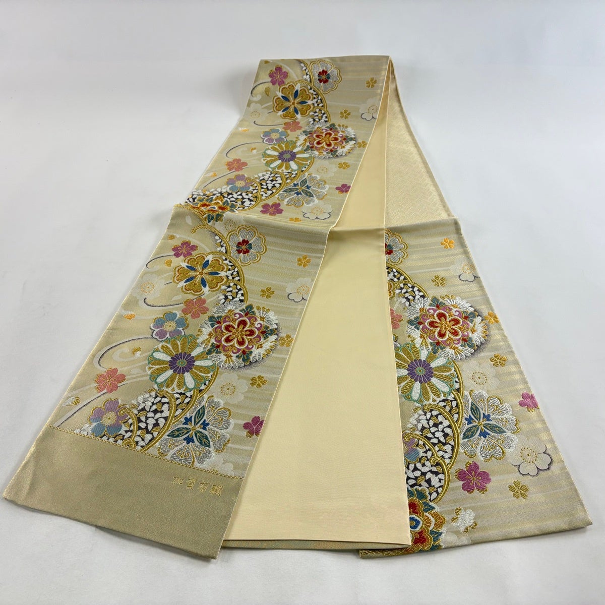 袋帯 秀品 川島織物 落款あり 関西仕立て 華文 金糸 箔 クリーム 六通 正絹