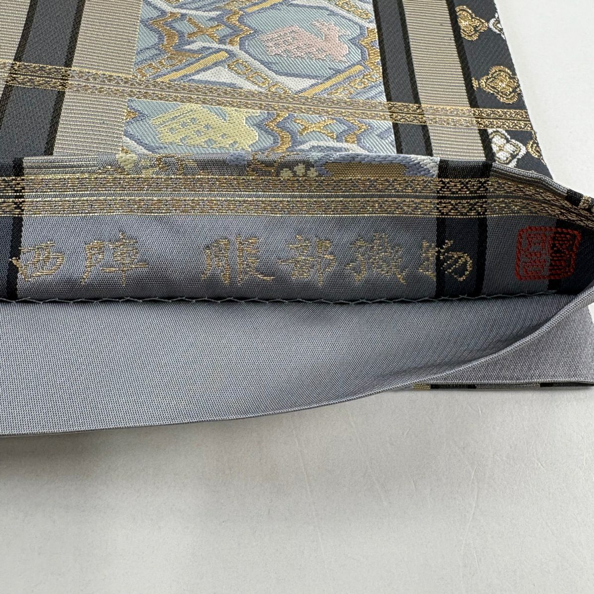 【在庫一掃】 袋帯 名品 輪奈織 鈴乃屋 向かい鳥 宝尽 金糸 箔 灰紫 全通 正絹