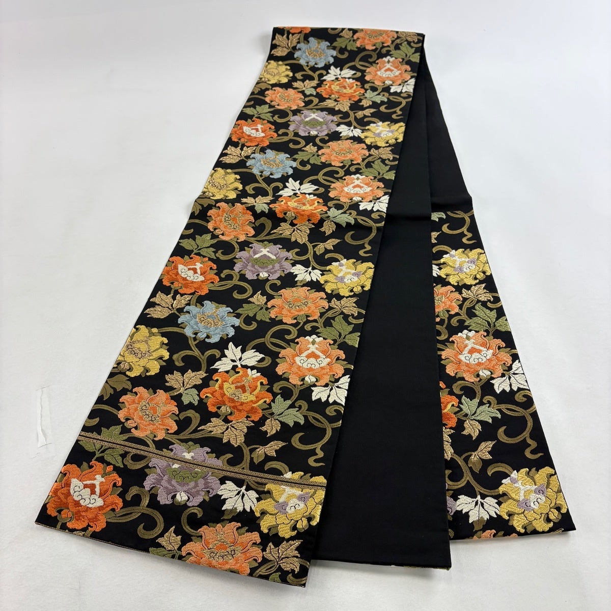 【美品】 袋帯 名品 服部織物 落款あり 関西仕立て 花唐草 金糸 箔 黒 六通 正絹