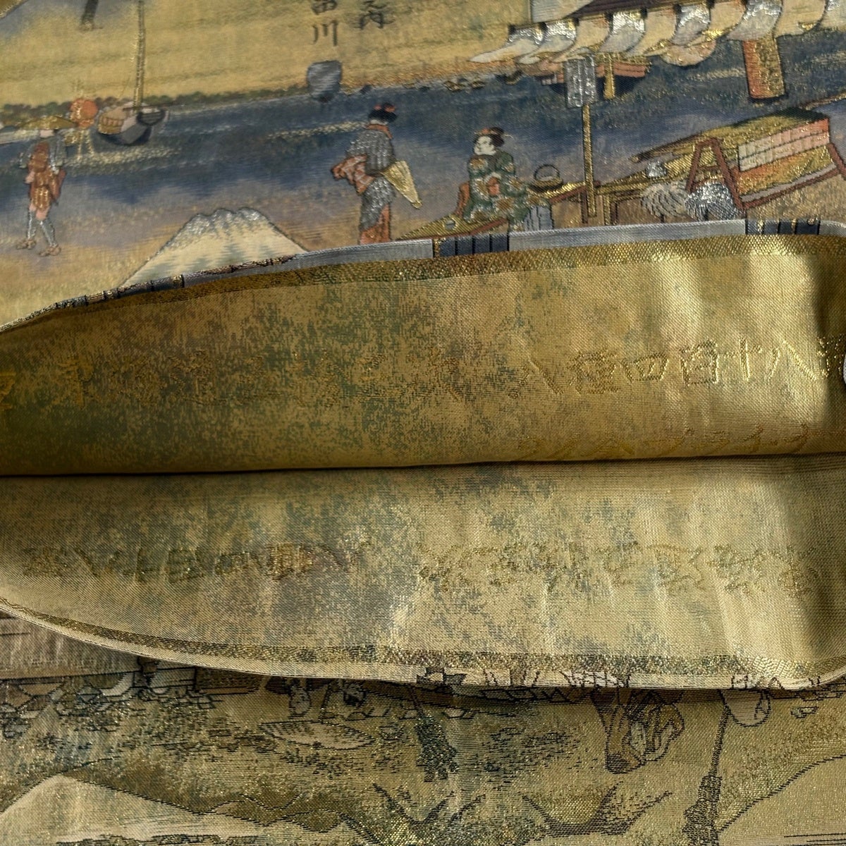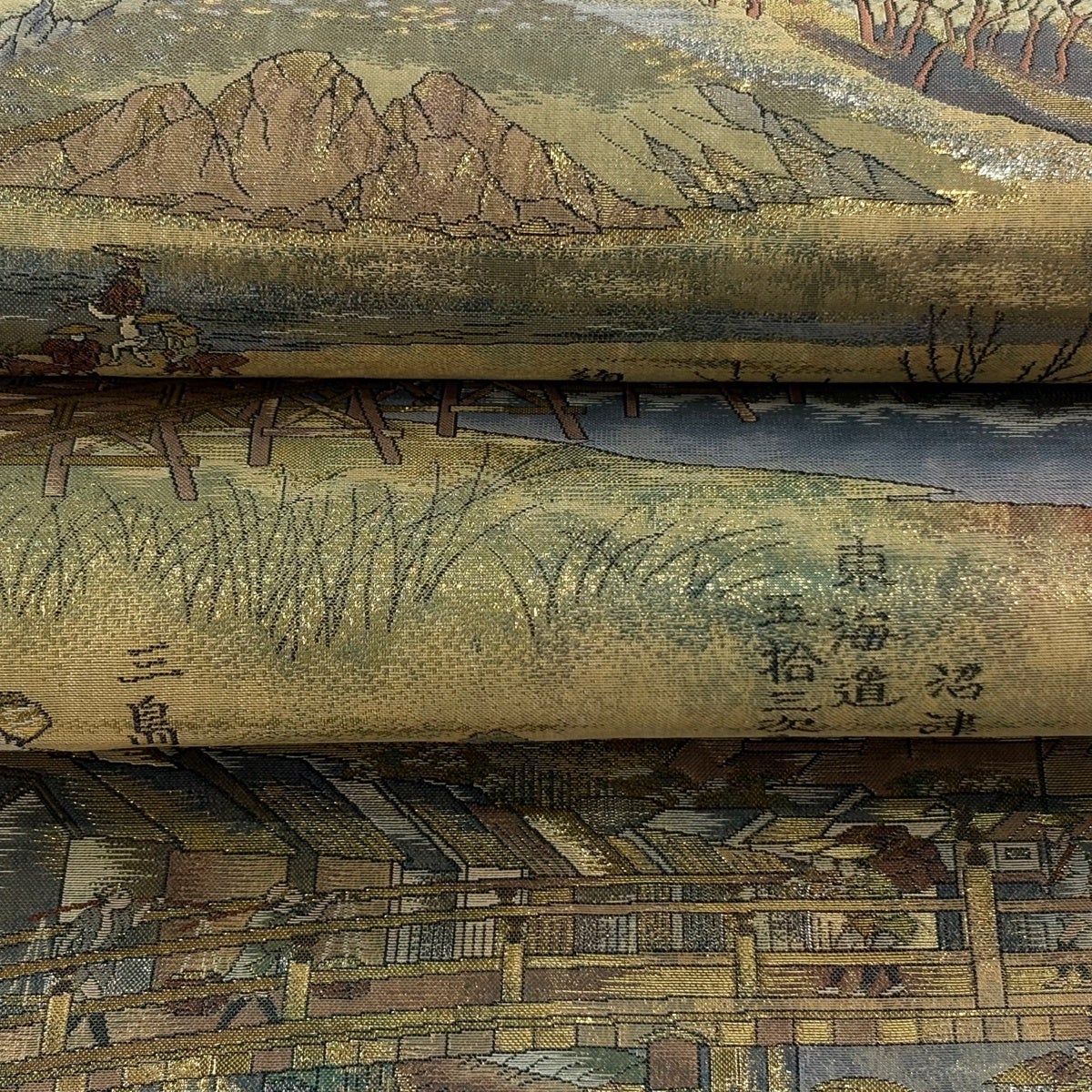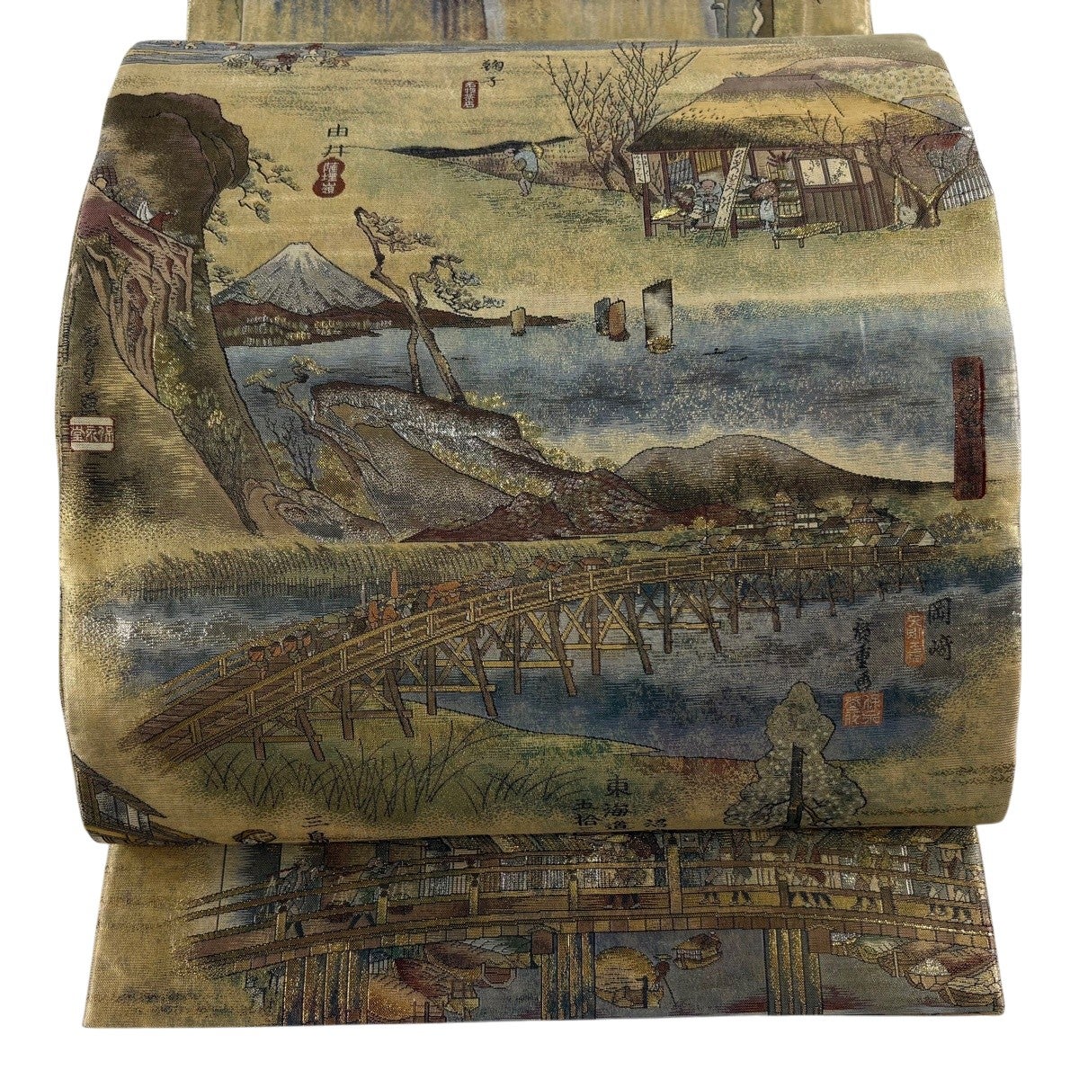 【美品】 袋帯 逸品 24金プラチナ二重箔 廣重 東海道五拾三次 八種四百十八景 箔 金色 お太鼓柄 正絹