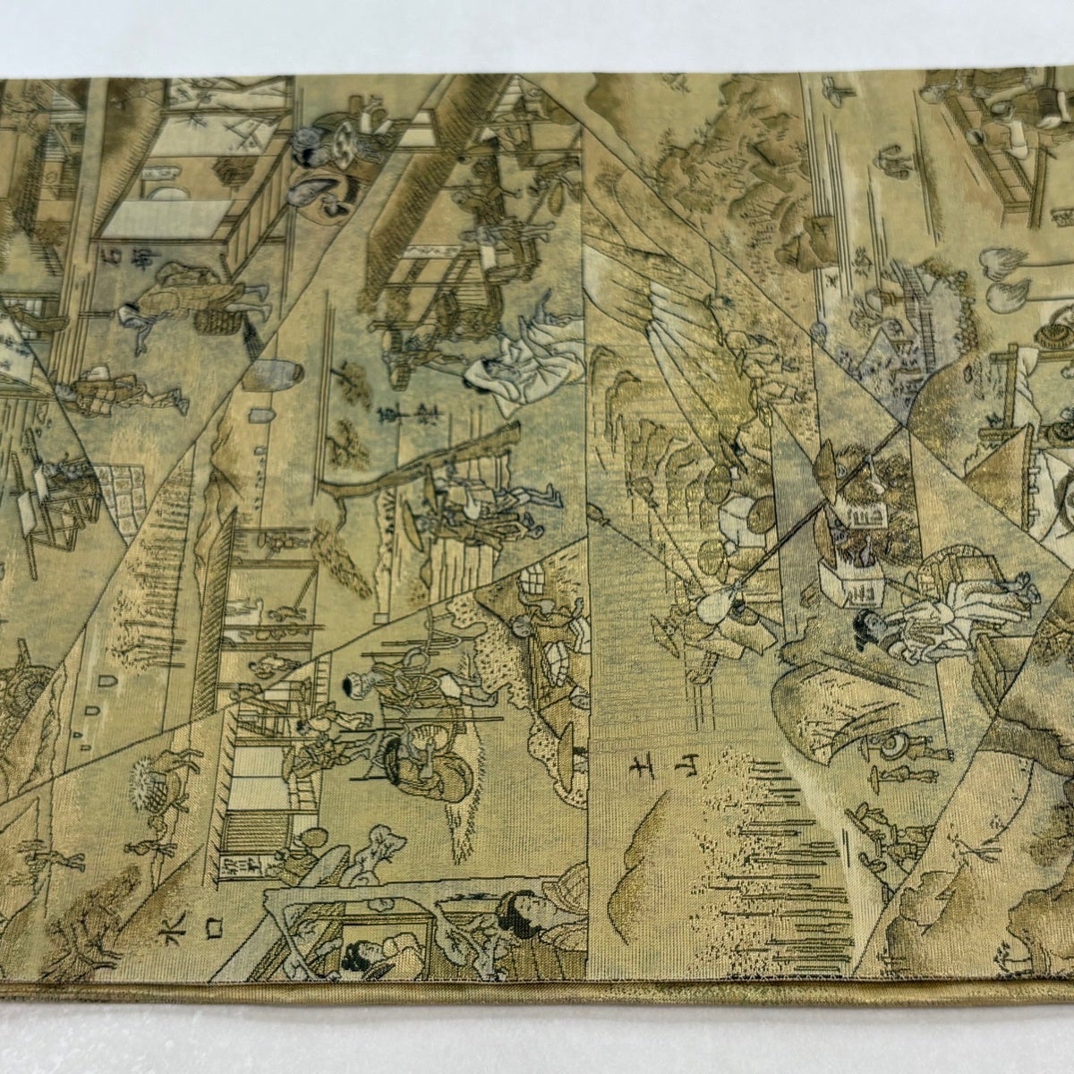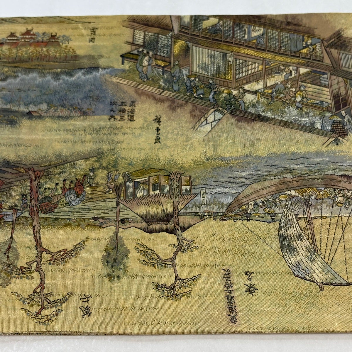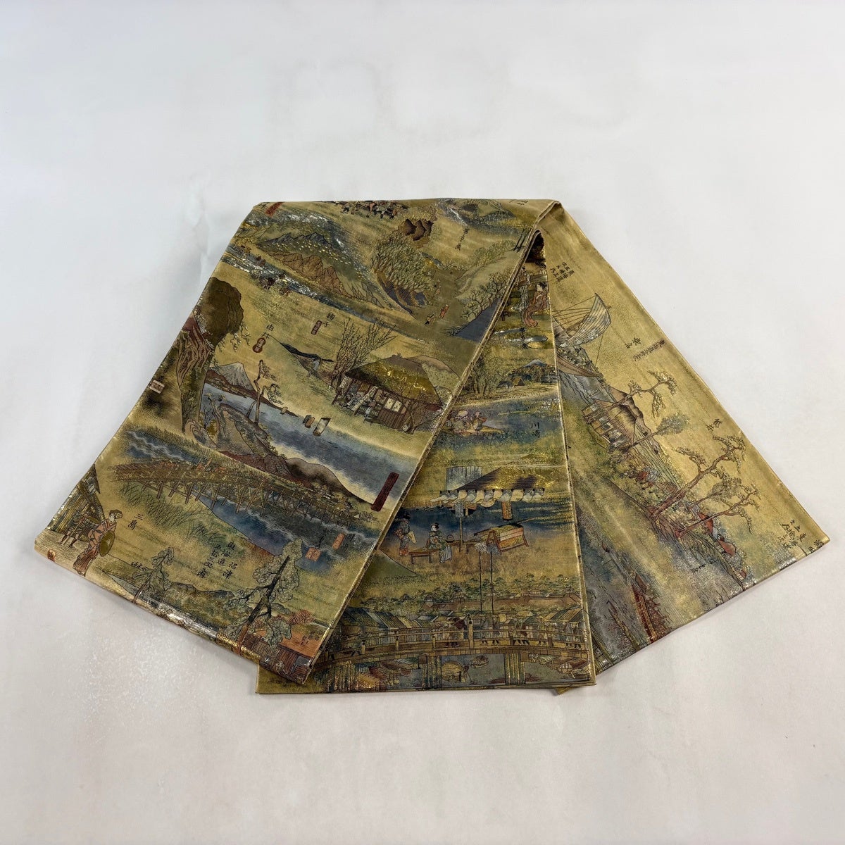 【美品】 袋帯 逸品 24金プラチナ二重箔 廣重 東海道五拾三次 八種四百十八景 箔 金色 お太鼓柄 正絹