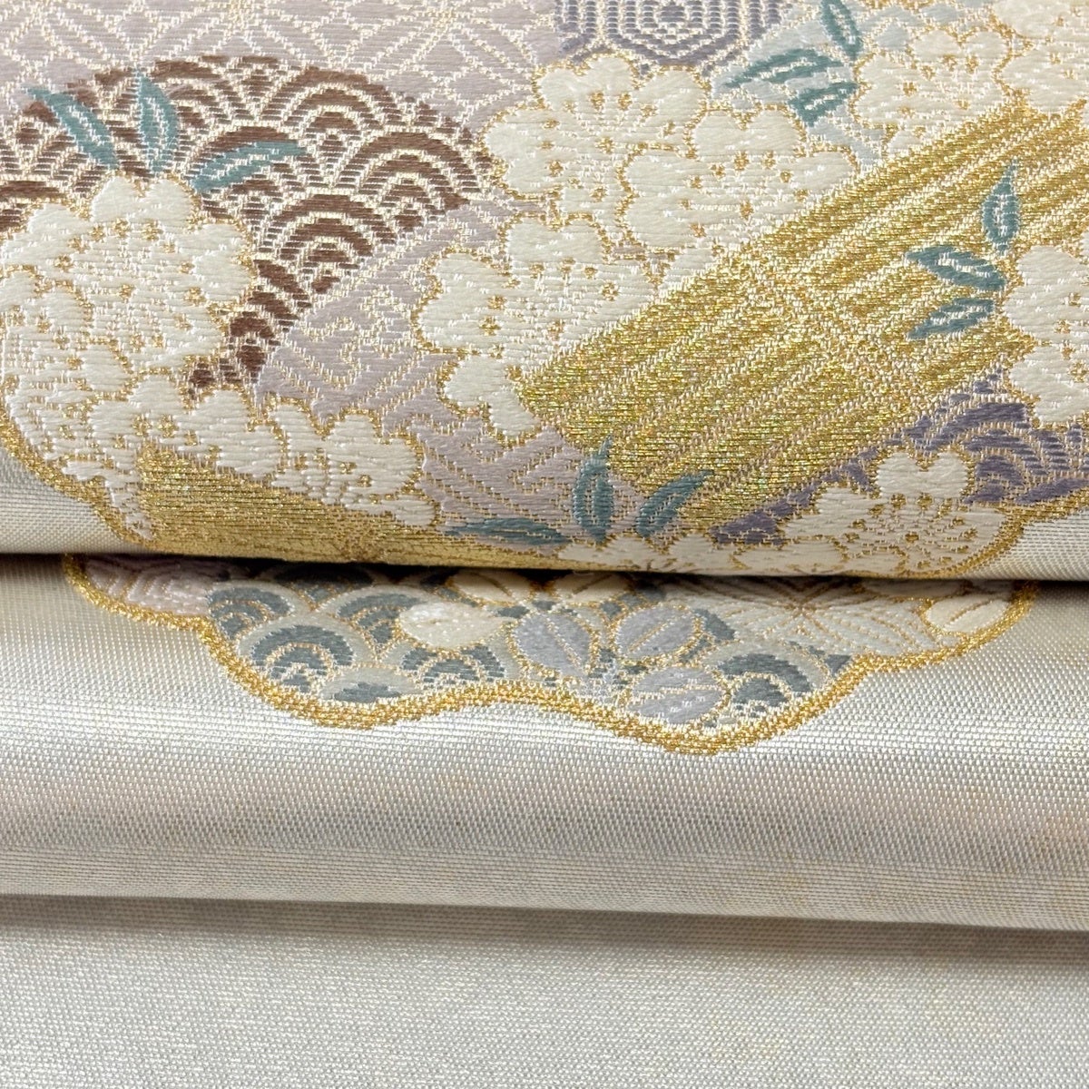 【美品】 袋帯 逸品 じゅらく 落款あり 証紙あり 帝王紫 扇面 花鳥 金糸 箔 ベージュ 六通 正絹