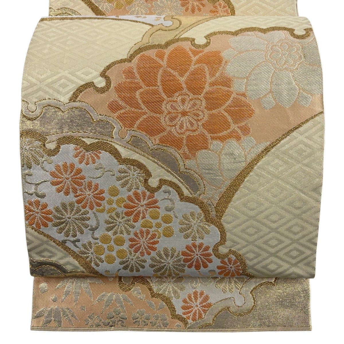 【美品】 袋帯 秀品 川島織物 落款あり 関西仕立て 本袋 扇面 御所車 金銀糸 箔 オレンジ 六通 正絹