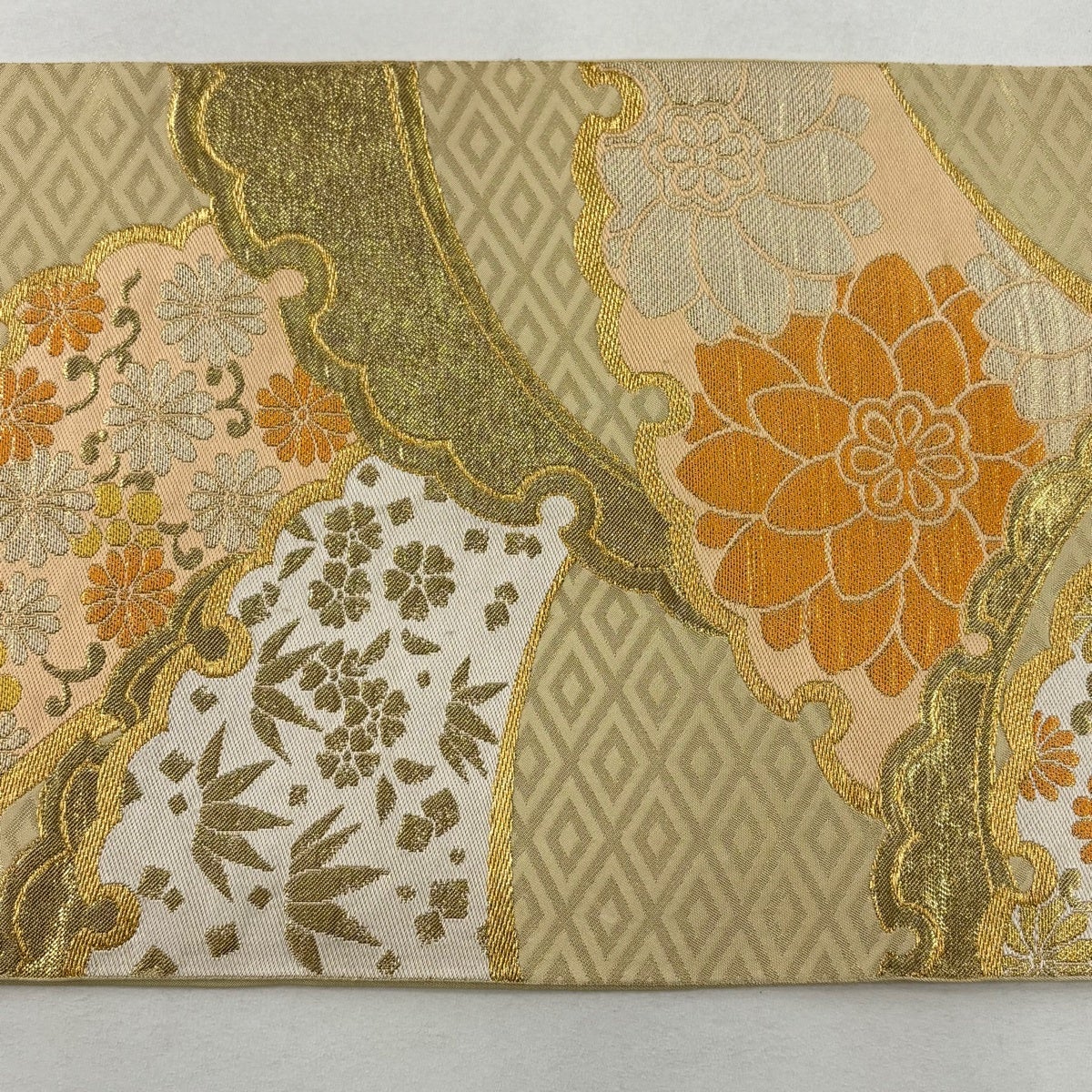 【美品】 袋帯 逸品 誉田屋源兵衛 落款あり 金唐草金華燦 斜め格子 幾何学模様 箔 金糸 金茶 お太鼓柄 正絹