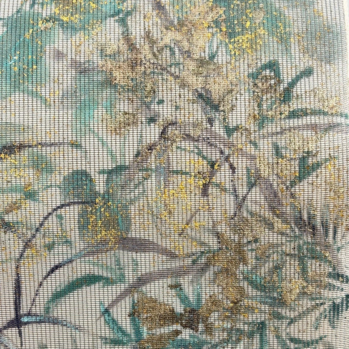 袋帯 秀品 落款あり 夏帯 朝顔 葉柄 金彩 灰色 お太鼓柄 正絹