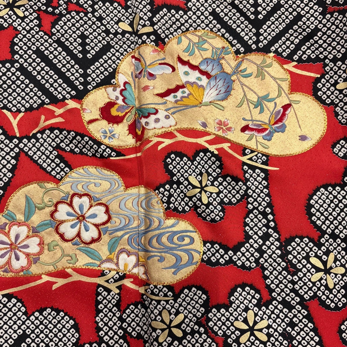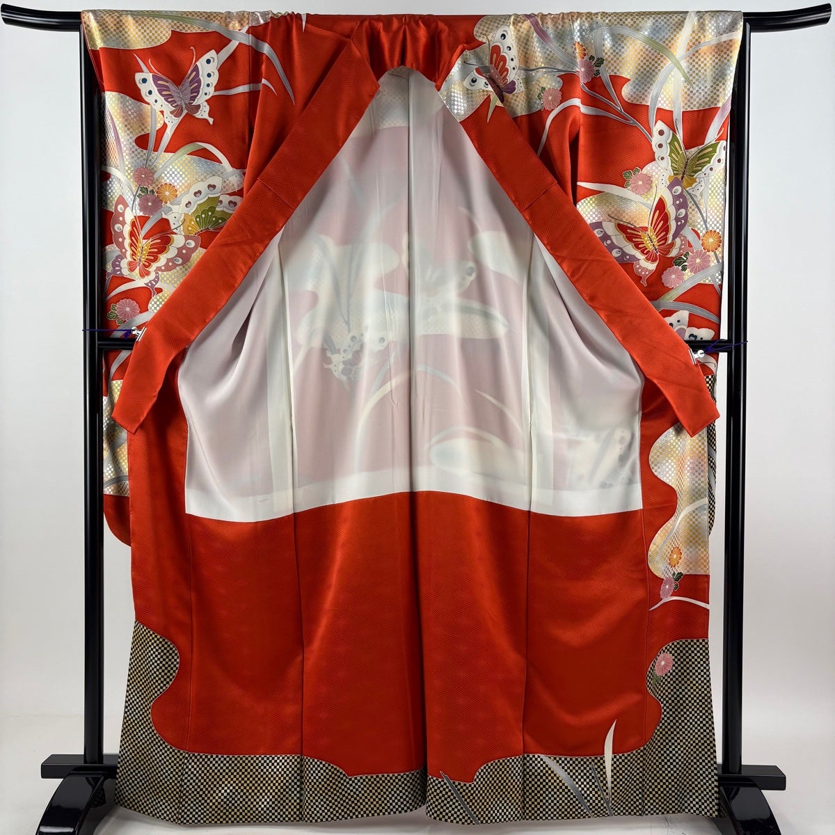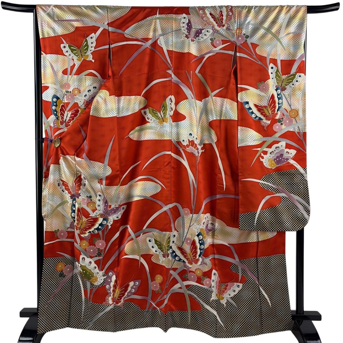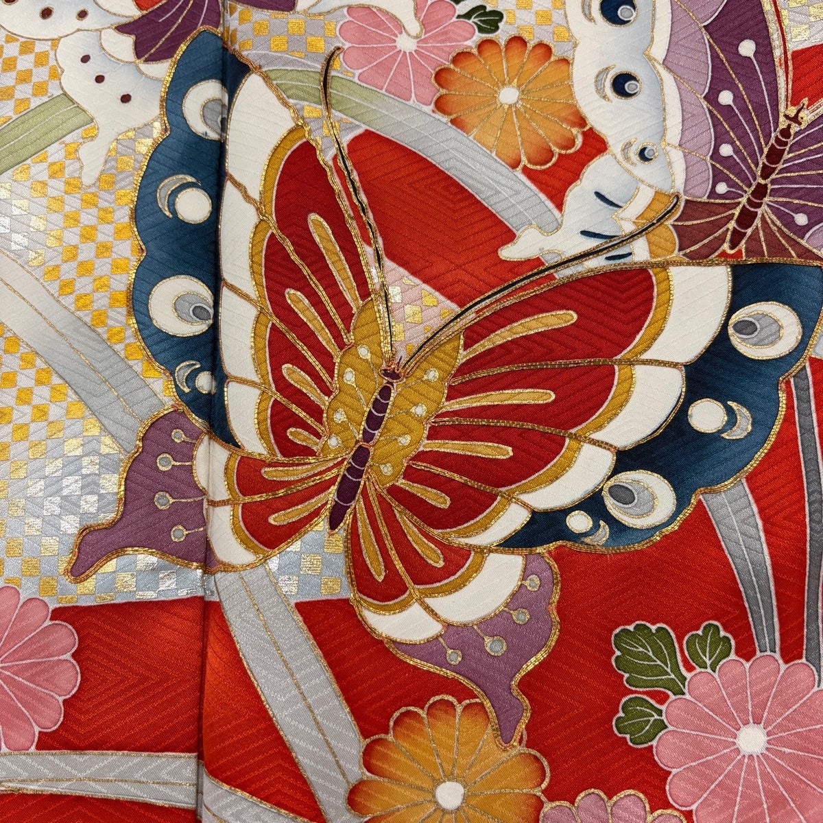 【美品】 振袖 身丈164cm 裄丈68cm L 袷 蝶 霞 金銀彩 金糸 朱色 正絹 秀品