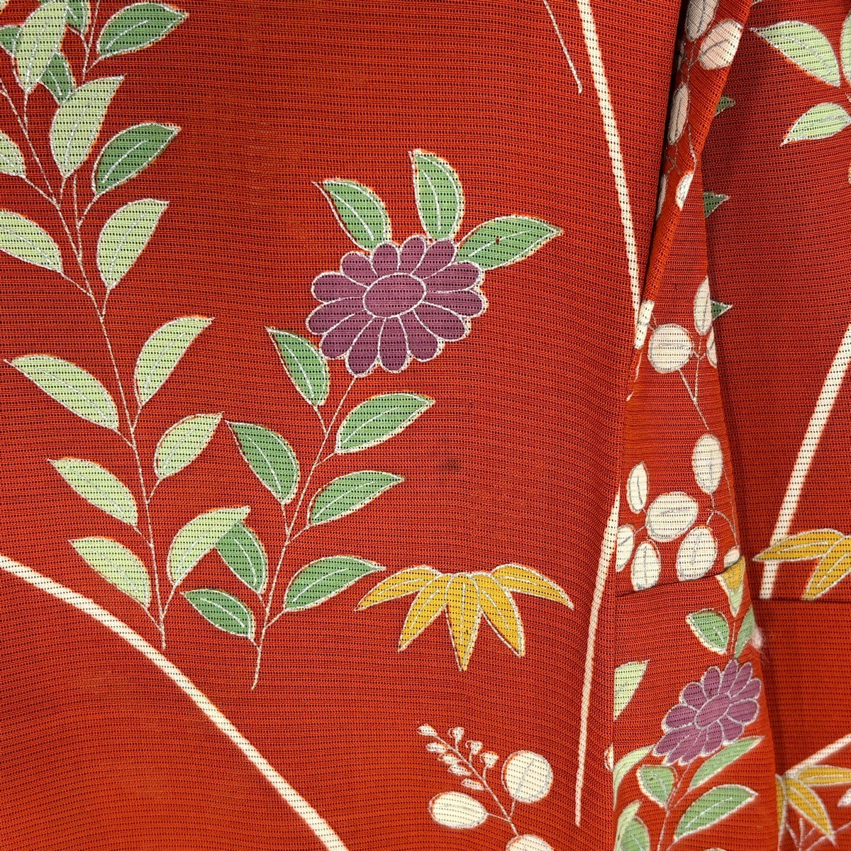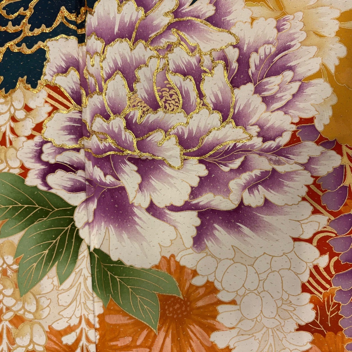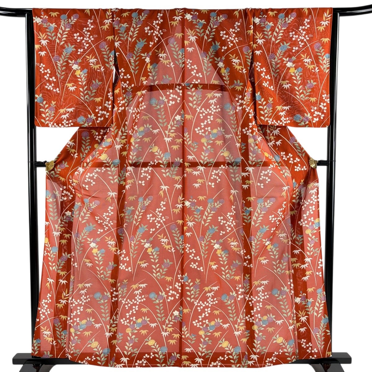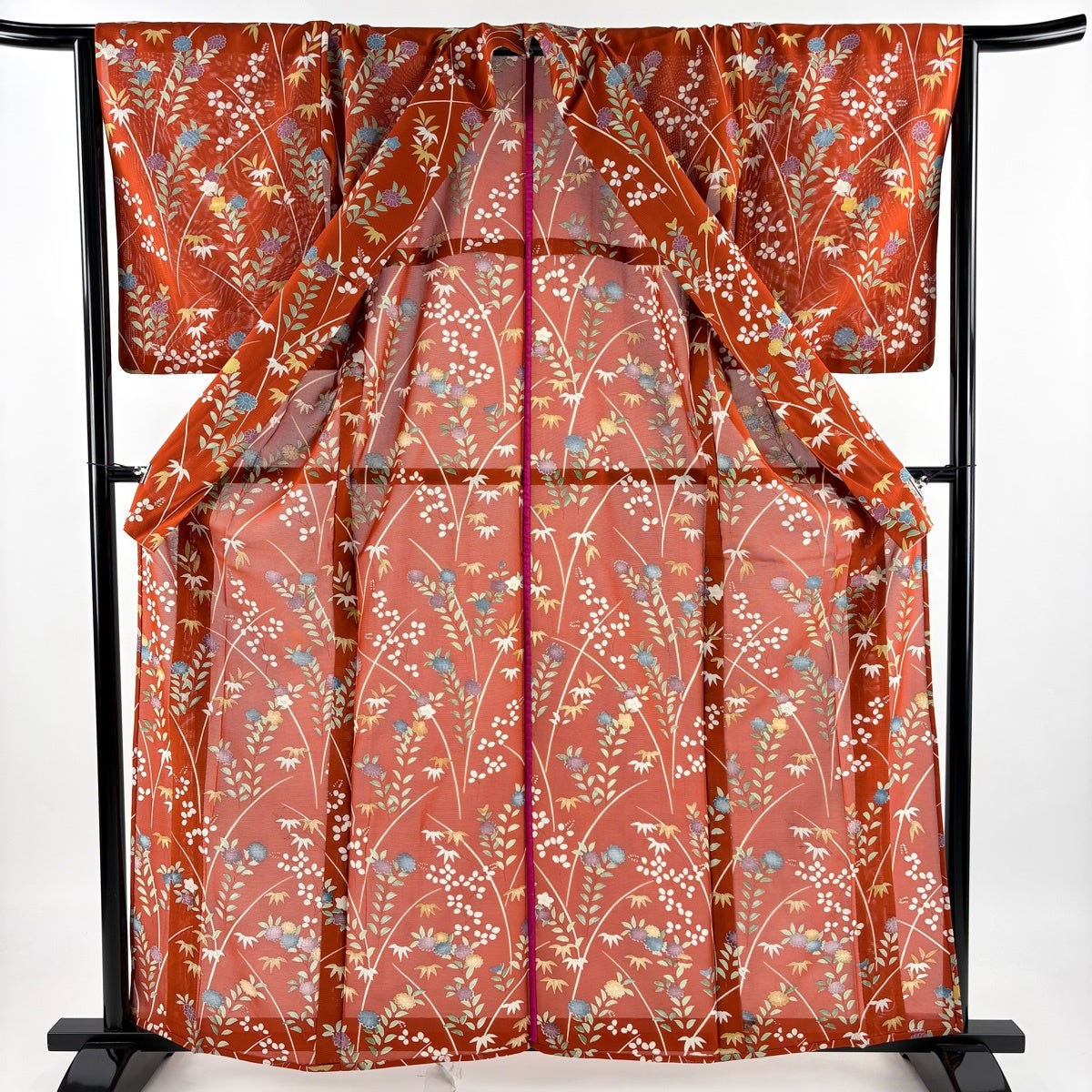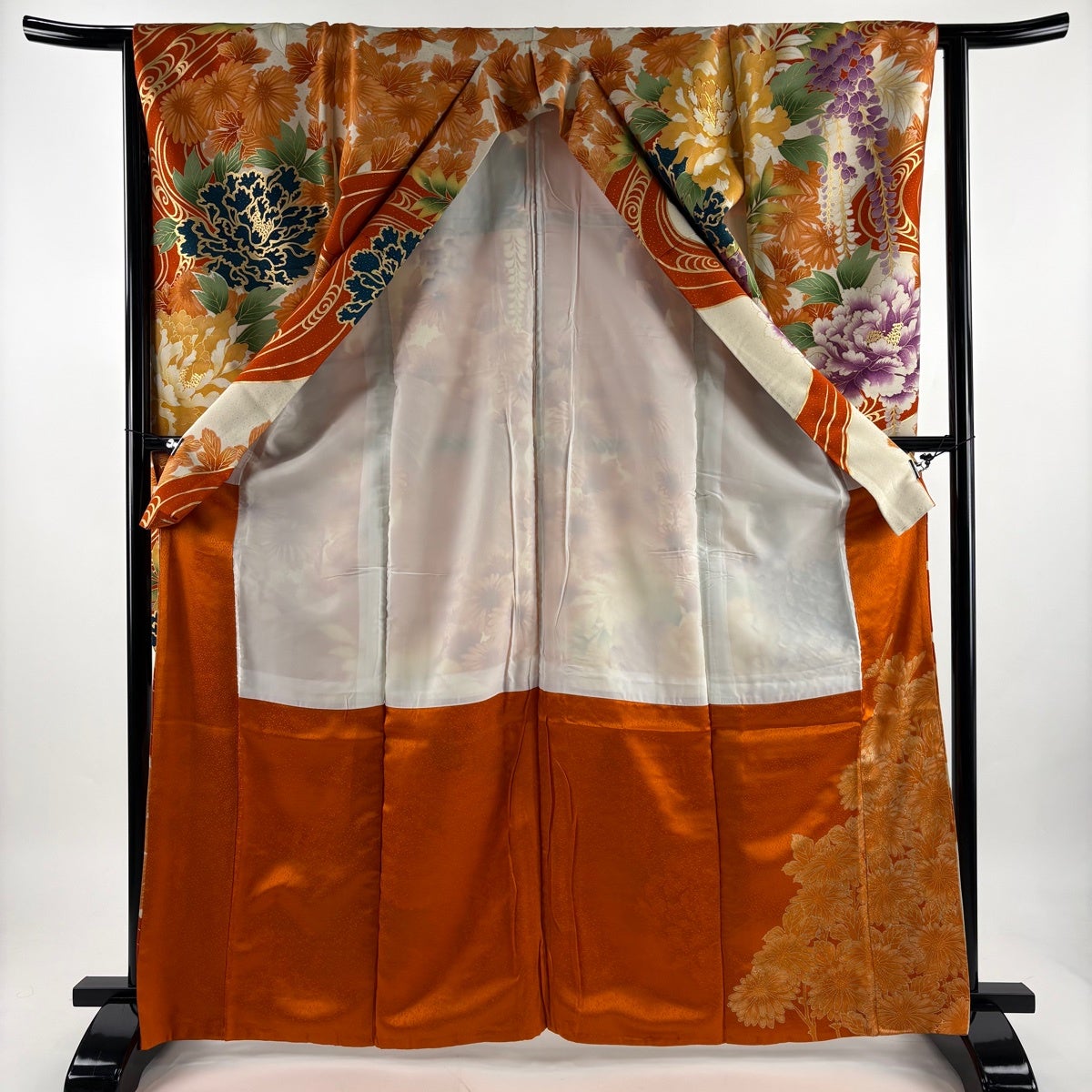 振袖 身丈159.5cm 裄丈67cm M 袷 片輪車 草花 金糸 金銀彩 朱色 正絹 秀品
