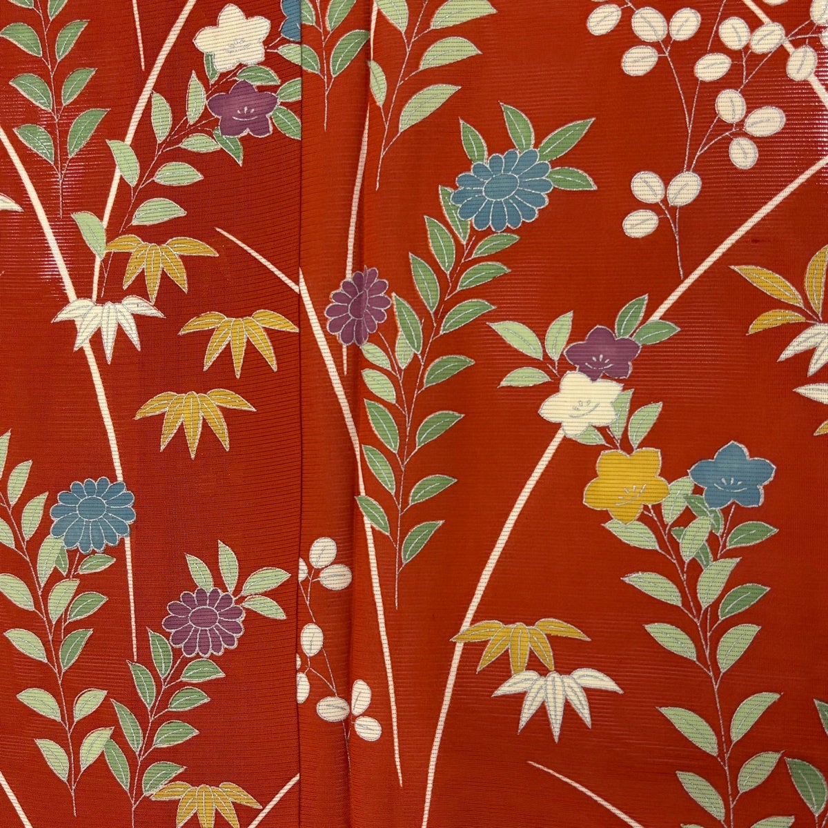 振袖 身丈161cm 裄丈64.5cm M 袷 松竹梅 蝶 銀通し 刺繍 朱色 正絹 秀品