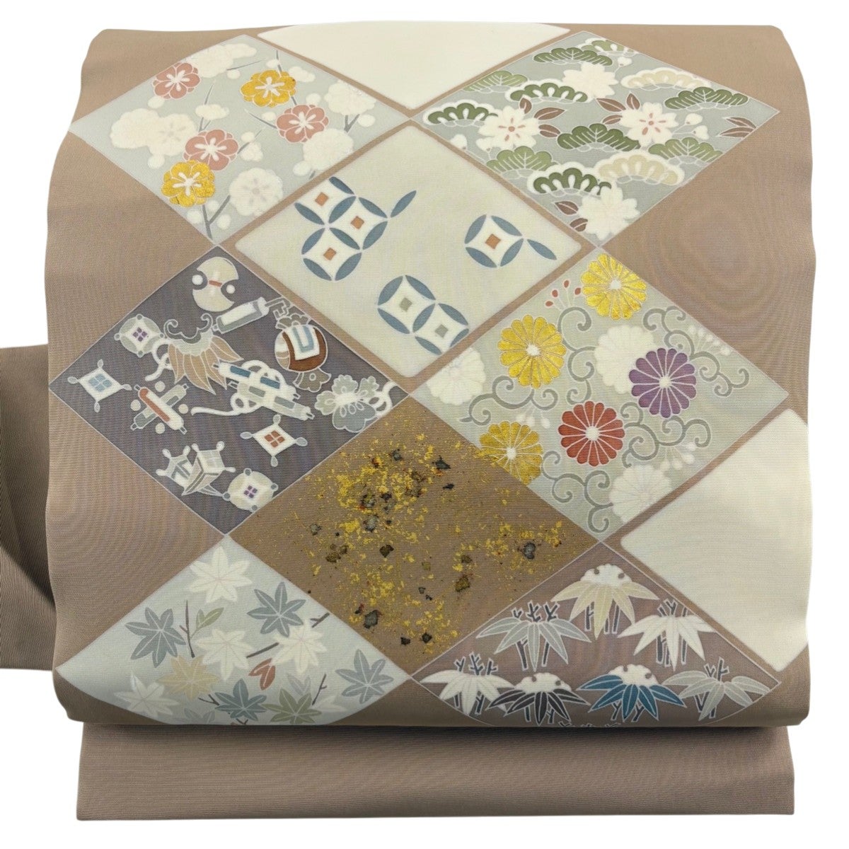 袋帯 秀品 松竹梅 鼓 金糸 箔 薄茶色 六通 正絹