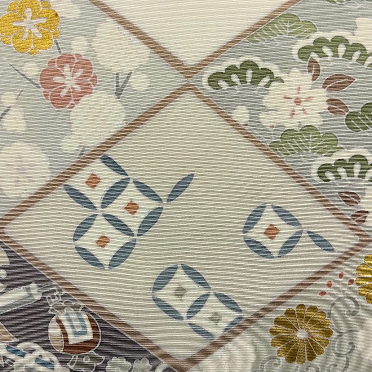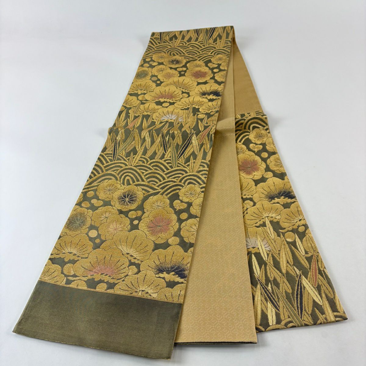 袋帯 秀品 松竹梅 市松 金糸 箔 灰緑 六通 正絹