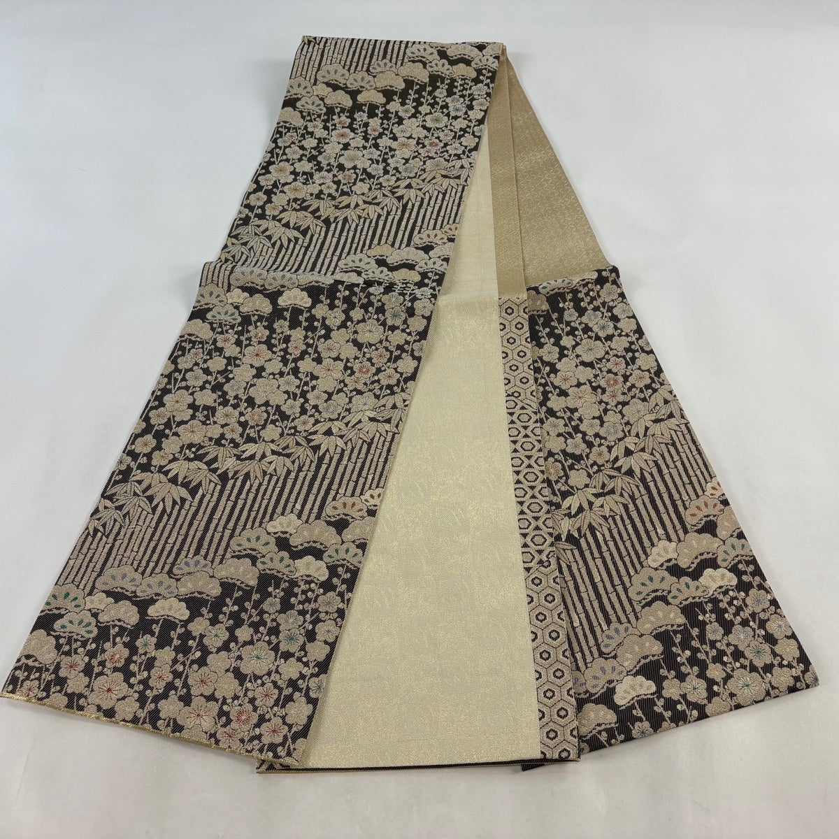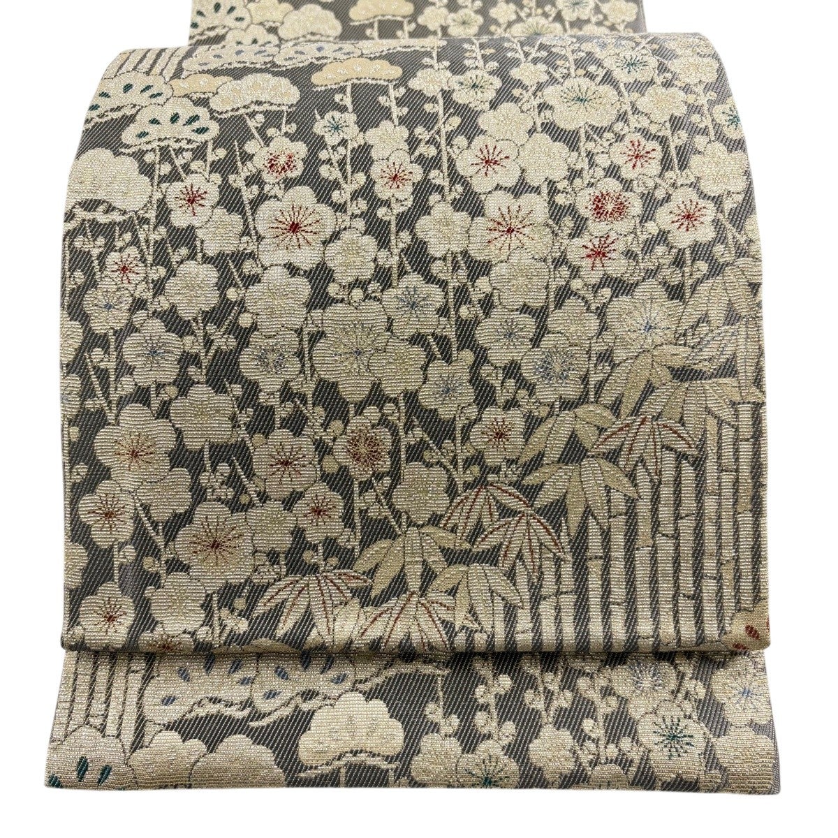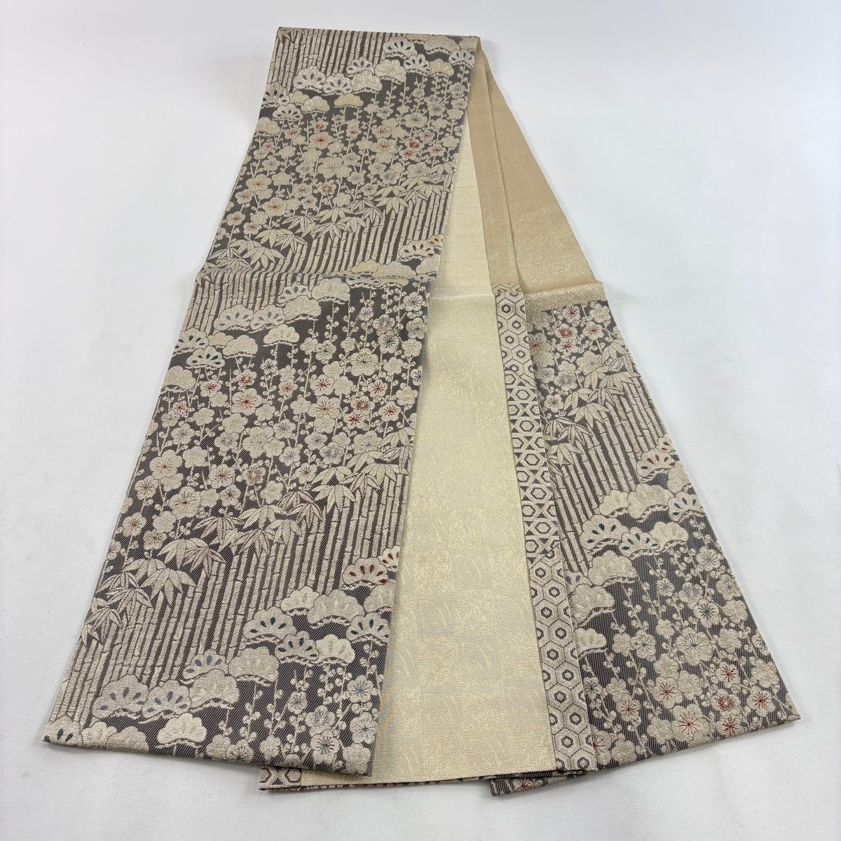 【美品】 袋帯 秀品 松竹梅 金糸 灰茶 お太鼓柄 正絹