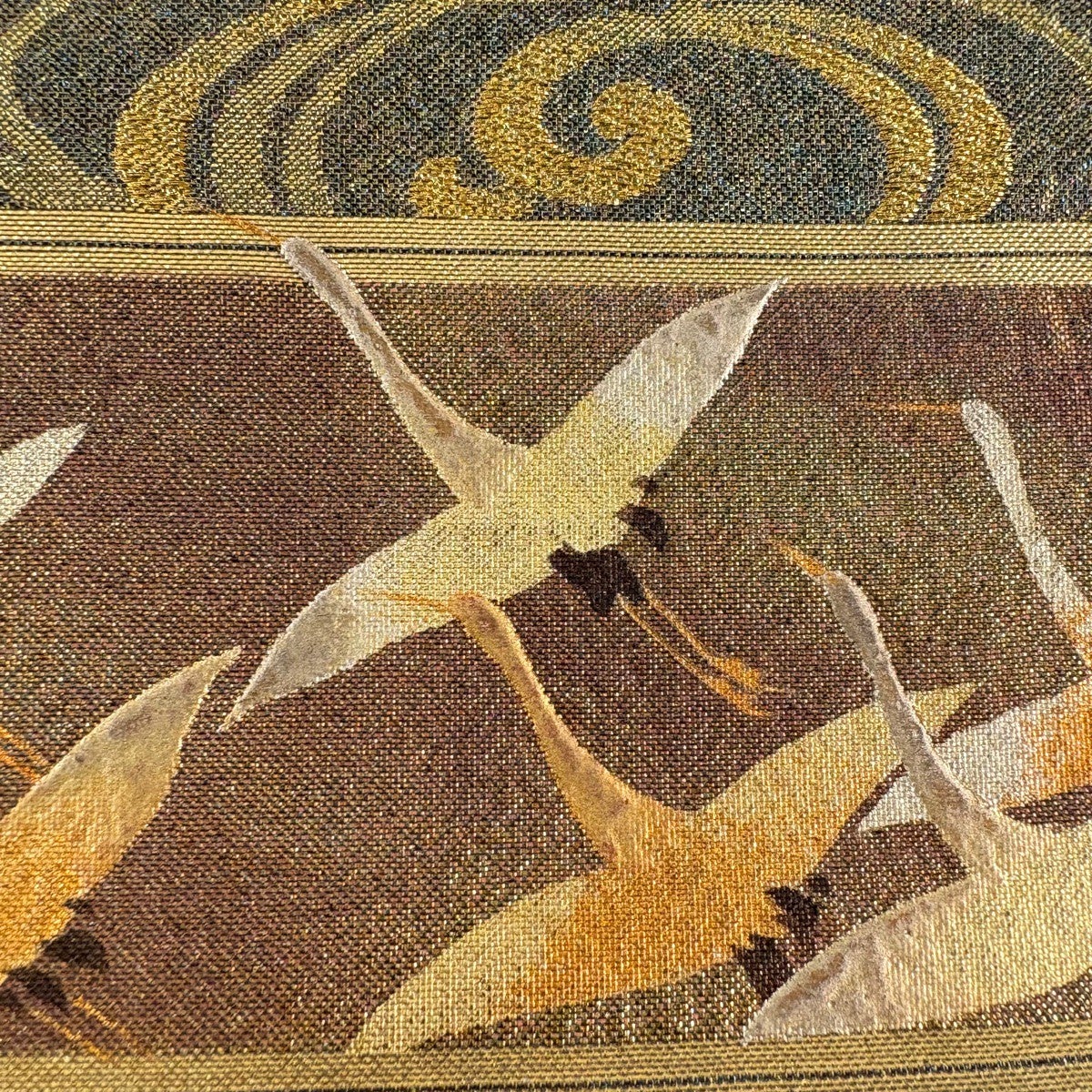 袋帯 秀品 松竹梅 鶴 金糸 箔 青灰色 六通 正絹