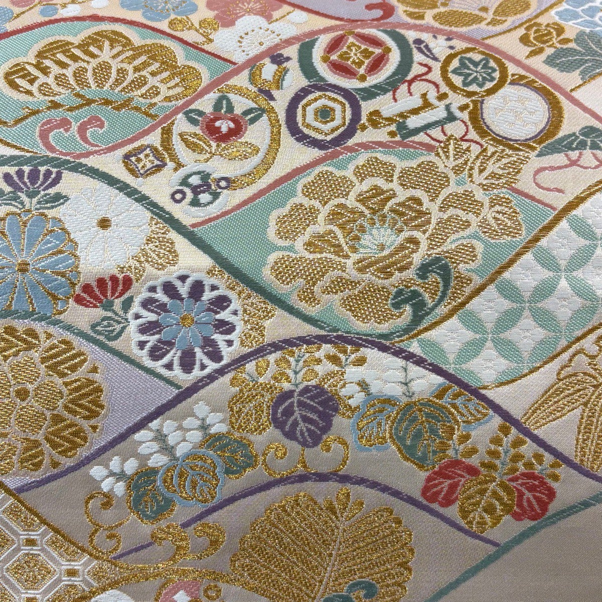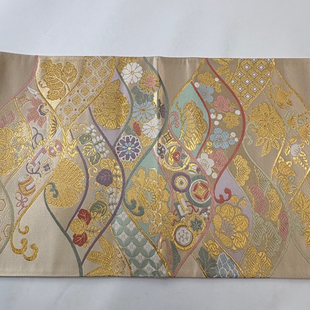 【美品】 袋帯 名品 松竹梅 宝尽くし 箔 ベージュ 六通 正絹