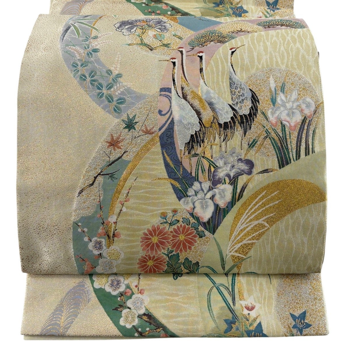 【美品】 袋帯 名品 松竹梅 鶴 金銀糸 箔 ベージュ 六通 正絹