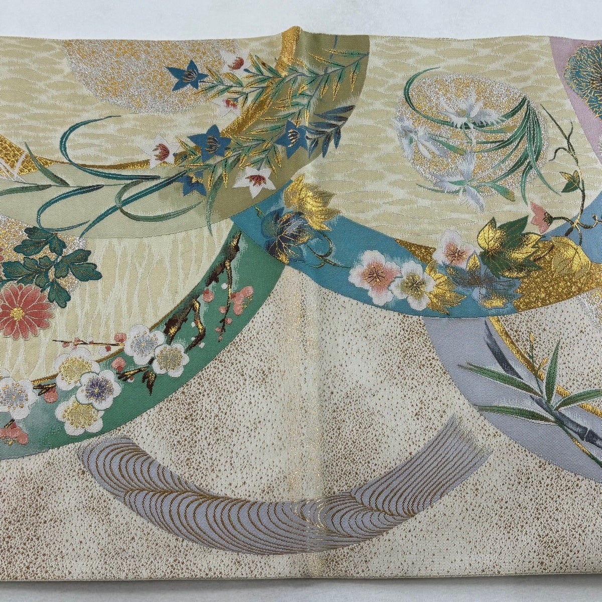 【美品】 袋帯 秀品 花丸文 松竹梅 刺繍 箔 ベージュ 六通 正絹