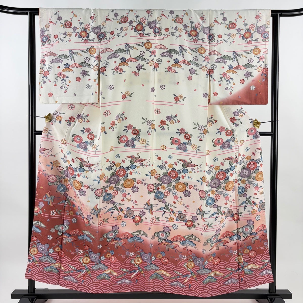 【美品】 訪問着 身丈155.5cm 裄丈62cm S 袷 松竹梅 鶴 ぼかし クリーム 正絹 秀品