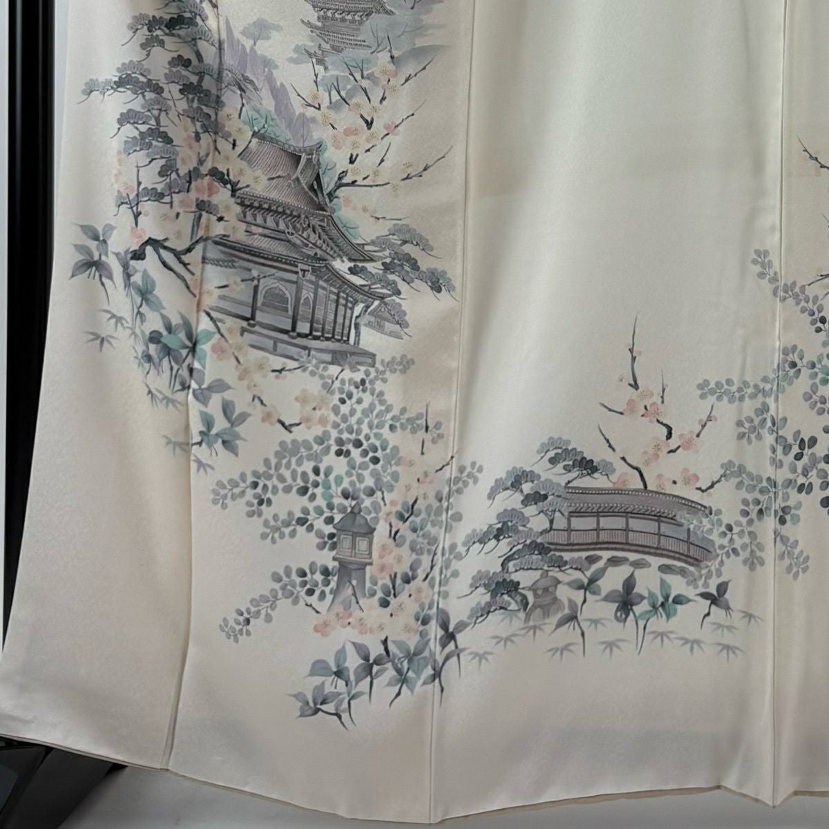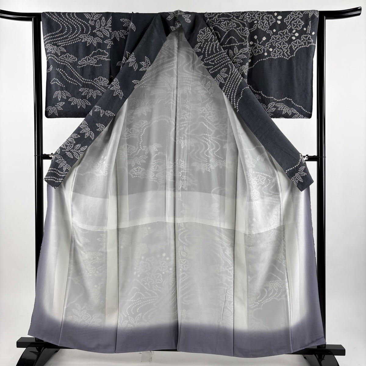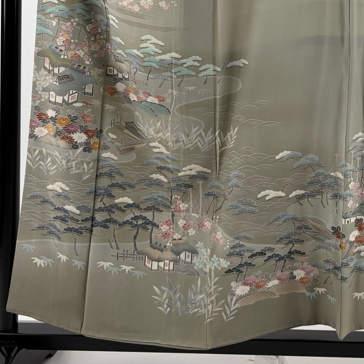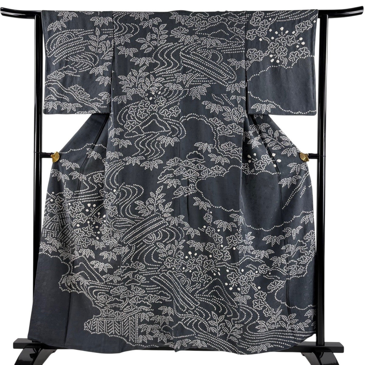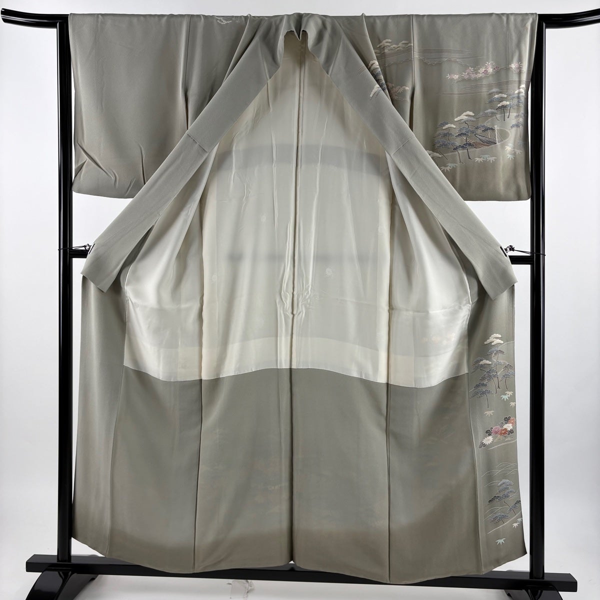 付下げ 身丈161cm 裄丈69cm L 袷 ますいわ屋 松竹梅 草花 金彩 絞り 黒灰 正絹 秀品