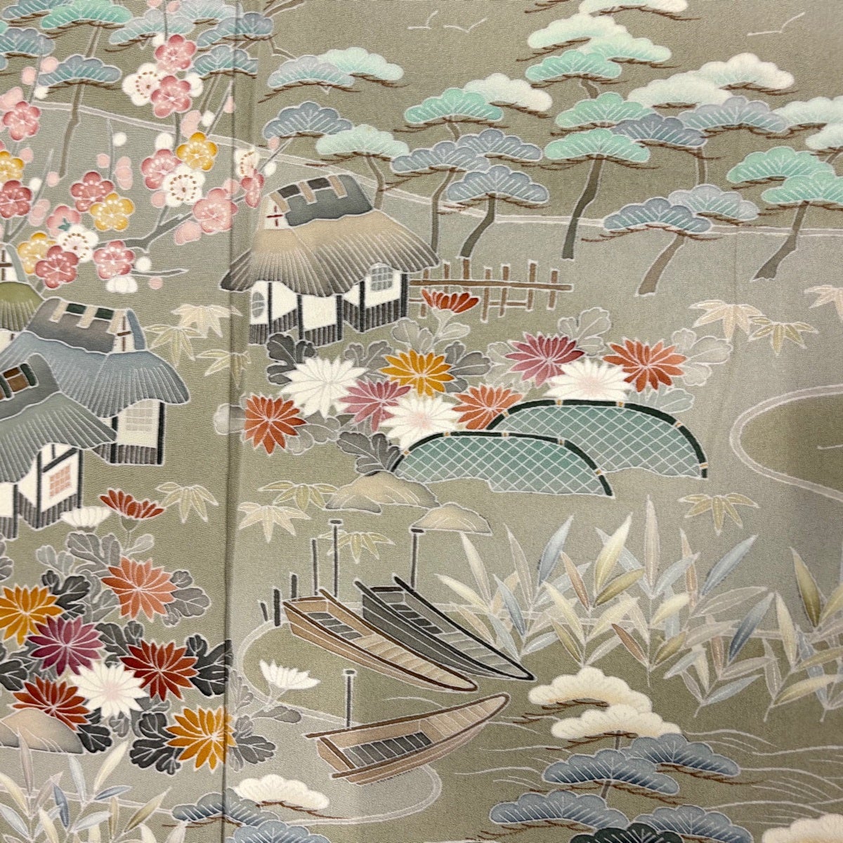 訪問着 身丈156cm 裄丈62.5cm S 袷 海辺の風景 松竹梅 金彩 ぼかし 灰色 正絹 秀品