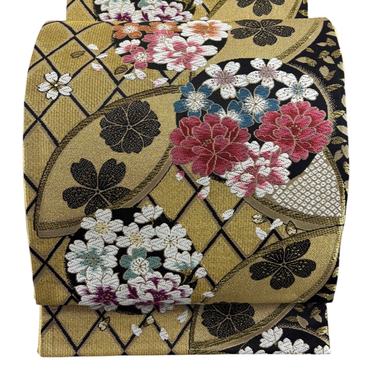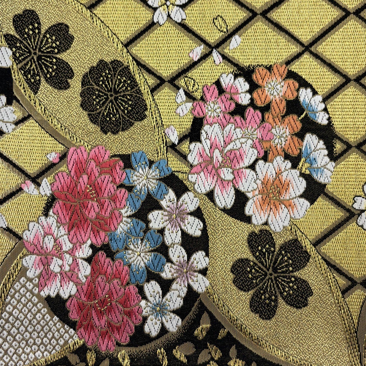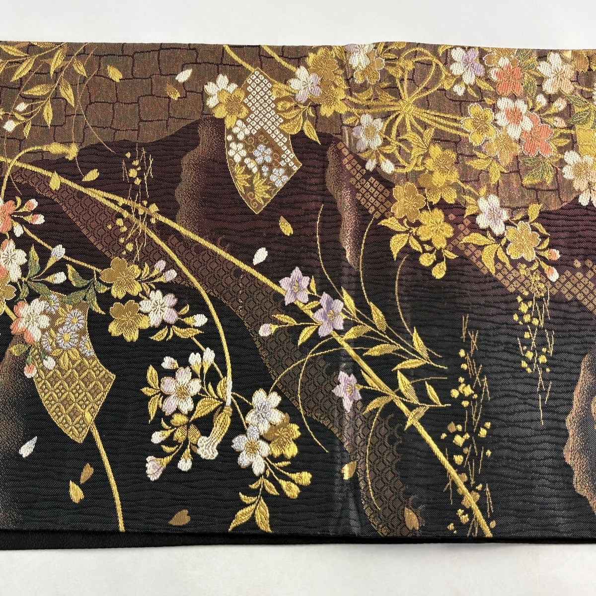 【美品】 袋帯 名品 桜 斜め格子 唐織 金糸 黒 六通 正絹