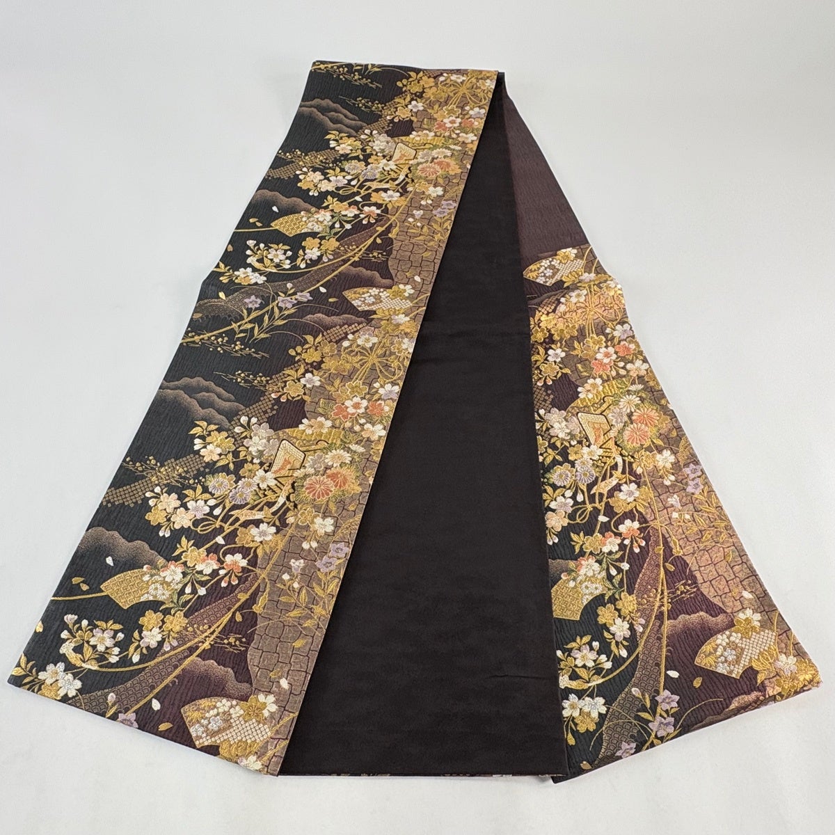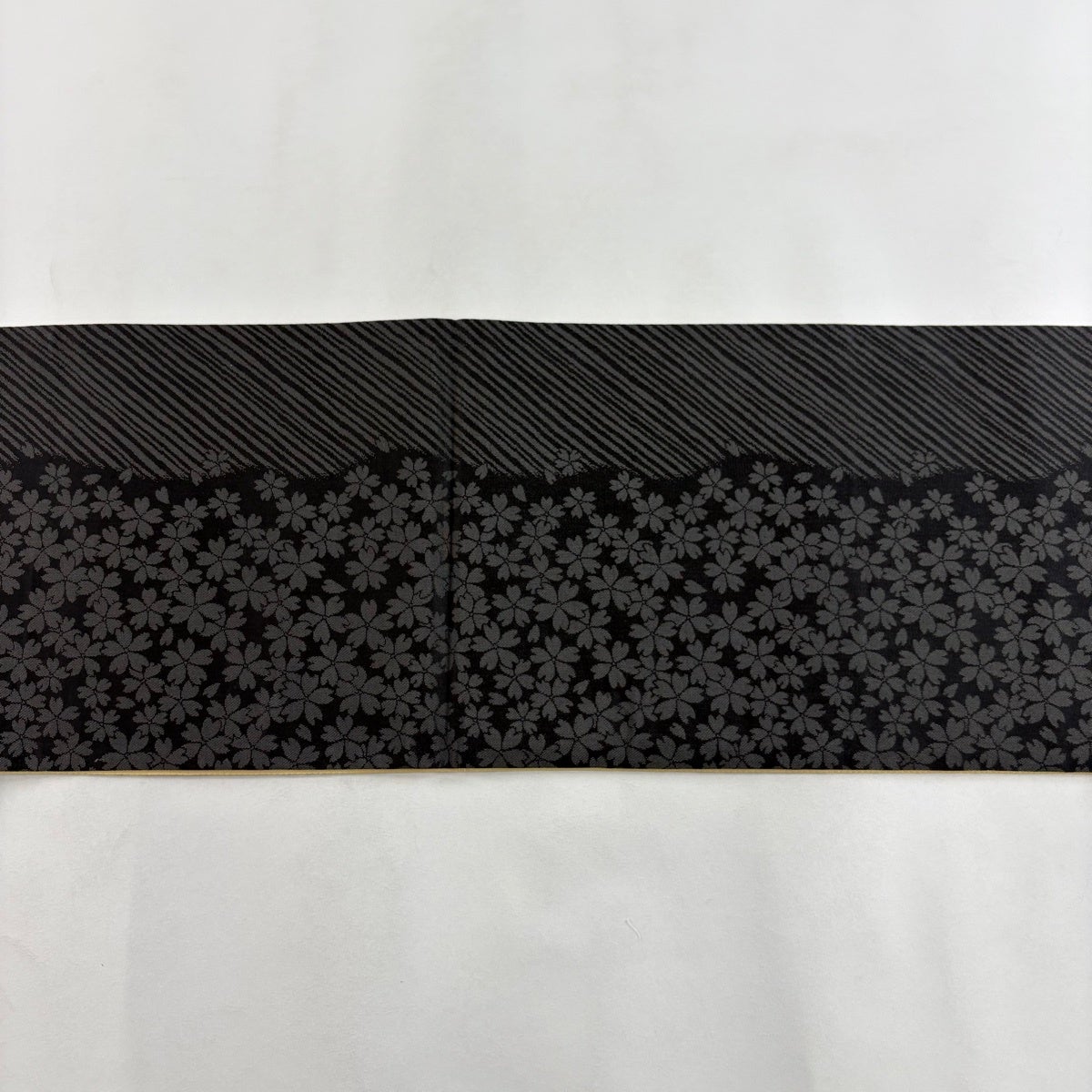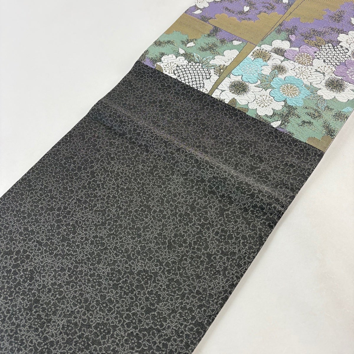 【美品】 袋帯 名品 桜 斜め格子 唐織 金糸 黒 六通 正絹
