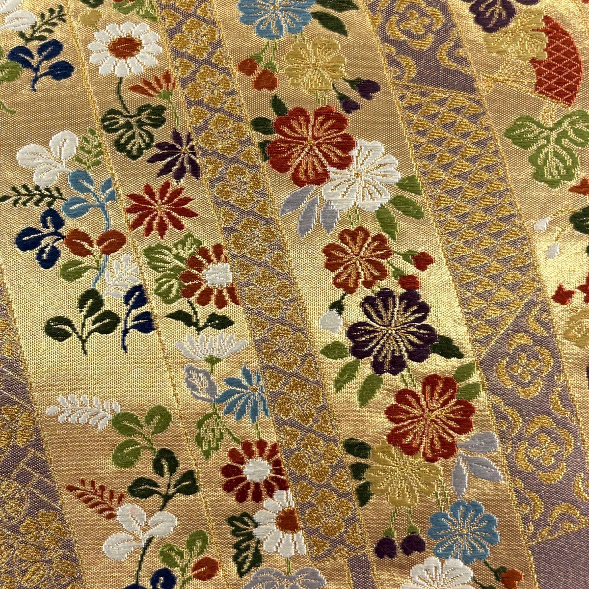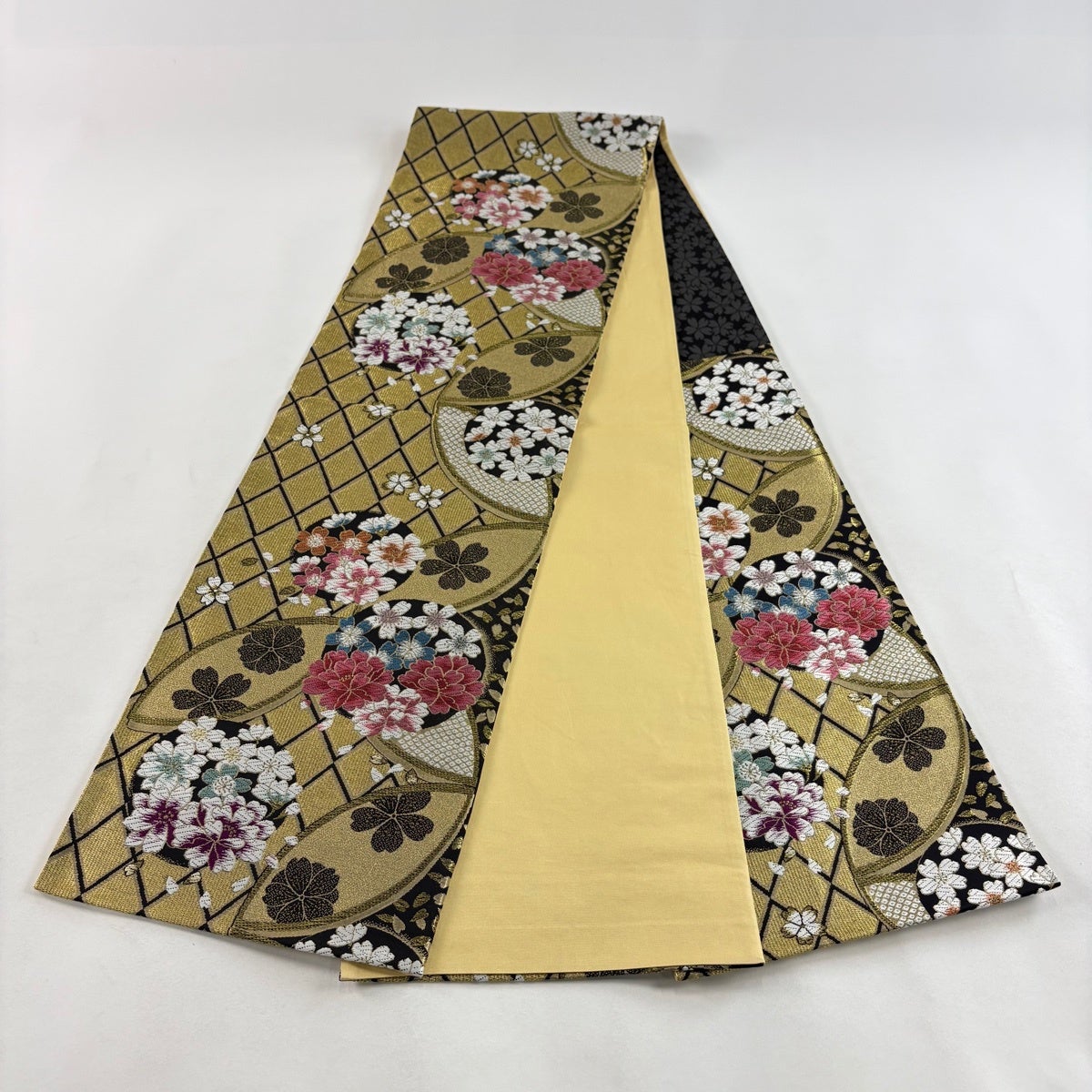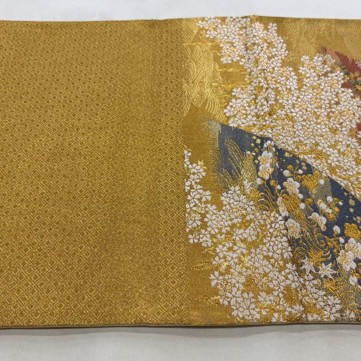袋帯 秀品 関西仕立て 桜 斜縞 金糸 箔 山吹色 六通 正絹